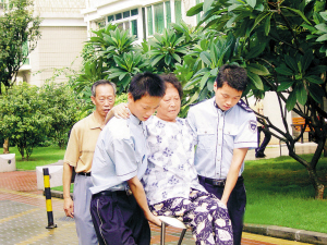 居住在蓮花二村13棟的殘疾人付大爺腿腳不好,進出不方便,平時很少下樓。得知這一情況,小區(qū)保安員當起了付大爺?shù)摹拜喴巍?,背他上下樓,成了社區(qū)感人的一道愛心風景線。