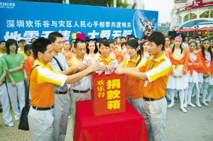 這是一串堅(jiān)實(shí)的愛的足跡——2005年1月,深圳歡樂谷組織員工為海嘯災(zāi)區(qū)獻(xiàn)愛心,共計(jì)捐款1萬多元,衣物1000多件;同年4月,歡樂谷組織員工為貴州貧困地區(qū)捐款1.5萬多元,衣物900多件;2007年,深圳歡樂谷攜手北京歡樂谷,啟動(dòng)以“十分·愛”為主題的公益募捐活動(dòng),從7月1日至10月8日的100天內(nèi),深圳歡樂谷每售出一張門票都會(huì)捐出一角錢,善款全部用于扶持黔東南貧困地區(qū)的教育事業(yè)。2008年汶川大地震后,歡樂谷向?yàn)?zāi)區(qū)捐款200萬,員工們自發(fā)捐款8萬元;2008年7月16日下午,歡樂谷接待了來自北川中學(xué)的百名學(xué)生。