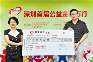 深圳特區(qū)報總編輯陳寅(右)代表“公益金百萬行”主辦方從陳國紅(左)手中接過十萬元支票。深圳特區(qū)報見習(xí)記者 何龍 攝