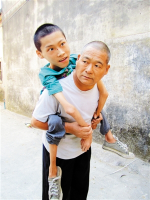 ????現(xiàn)今,王中民每每從工廠做完清潔回來,不管多晚,都會(huì)背著兒子出門,他背的姿勢也很獨(dú)特,兒子的兩只瘦腳被他夾在腋下,兩手抓著兒子的兩手?!拔冶沉?xí)慣了,一點(diǎn)都不覺得他重?!?/p>