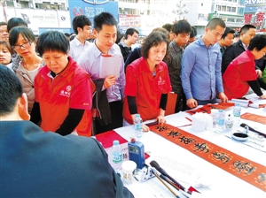近日,福田區(qū)書法家協(xié)會的書法家,在華強北商業(yè)街舉行了“第二屆關(guān)愛滿福田幸福進萬家——百名書法家進社區(qū)送春聯(lián)活動”,二十多名書法家當(dāng)場揮毫為市民群眾書寫蛇年春聯(lián),義工們協(xié)助書法家們擺放對聯(lián)、解答問題,還出動了老年腰鼓隊助興表演,現(xiàn)場氣氛十分熱烈。