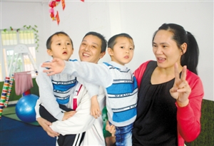 康復(fù)中心建立之后,徐維初就將自己的孩子帶進(jìn)來做康復(fù)。如今,孩子能蹦能跳,兄弟倆也開始主動(dòng)找人玩,正在一步步好轉(zhuǎn)。昨天,記者在康復(fù)中心一樓訓(xùn)練室看到,徐維初的雙胞胎兒子在老師的指導(dǎo)下玩游戲、盡情地蹦跳,“看到他們和其他的孩子都在慢慢在恢復(fù),再多的付出也值得了?!蹦且豢?,徐維初很滿足。