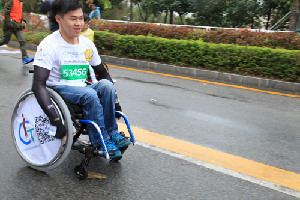 ????而去年首次參賽的24歲殘障人士林文超,今年不僅繼續(xù)參賽,用輪椅挑戰(zhàn)體驗組別10公里,還組織了11位殘障選手一同參加。
