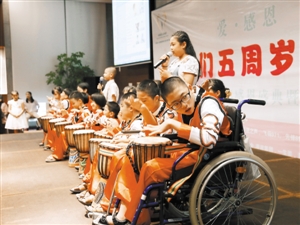 日前,深圳“天使家園” 迎來了五周年盛典?!疤焓辜覉@”創(chuàng)辦以來,開展腦癱特困兒童救助及幫扶1351人次,服務(wù)腦癱兒童家庭突破500戶,并成立“天使媽媽再就業(yè)基金”及“天使”愛心互助組3個242人,扶持200多位媽媽再就業(yè)工程等,傳遞著愛的接力。圖為為感恩社會及老師們的關(guān)愛,腦癱兒童們打起非洲鼓《藍精靈》。