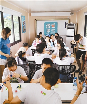 在潛愛手工坊,學(xué)員們可以用五顏六色的橡皮泥制作自己心中最美的海洋生物:藍鯨、魔鬼魚、珊瑚;觀珊瑚,近距離的看見水面之下的珊瑚寶寶長勢如何,普及了海洋救生知識和海洋豐富的物種;走沙灘,親眼觀察、觸摸到貝殼等生物,體驗鮮活的海洋生物保育知識,了解到人類與海洋是命運共同體。