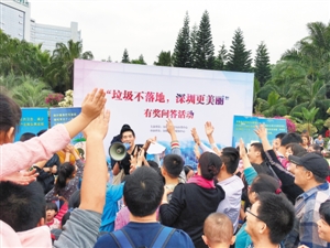 【深圳商報(bào)訊】(記者 文燦 文/圖)為讓市民進(jìn)一步加深對(duì)垃圾分類(lèi)知識(shí)了解,積極參與到垃圾分類(lèi)工作中來(lái),并正確掌握垃圾分類(lèi)的方法,上周六,市城管局垃圾分類(lèi)中心和深圳商報(bào)在蓮花山公園廣場(chǎng)開(kāi)展了“垃圾不落地,深圳更美麗”有獎(jiǎng)問(wèn)答活動(dòng),吸引了上萬(wàn)市民參加。