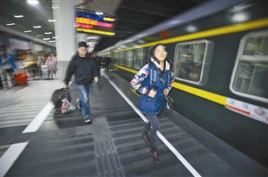 ,深圳火車站2017年春運首趟臨時旅客列車K4076次即將發(fā)出,乘客匆匆踏上歸家旅程。