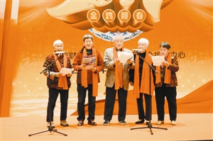 老人們?cè)谂_(tái)上進(jìn)行合唱表演。