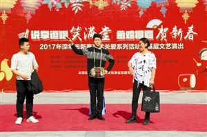 2017年“新春藝術關愛系列活動”是深圳一項重要的品牌文化活動,也是每年深圳市關愛活動重點項目之一,已成功連續(xù)舉辦九屆。今年延續(xù)以“我們的中國夢”文化進萬家為主題,活動跨度一個多月,包含展覽、文藝演出、書法家送春聯(lián)等多種文藝活動共計45項,本次“說學逗唱笑滿堂、金雞報喜賀新春”走基層文藝演出便是其中一場,他極大地豐富了來深建設者的業(yè)余文化生活。