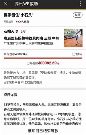 10日9:25,羅外初中部負(fù)責(zé)人肖繼宏從“騰訊WE救助”平臺(tái)上看到“該項(xiàng)目已結(jié)束籌款”幾個(gè)字,感到既驚訝又欣慰——沒(méi)想到為救“小石頭”而發(fā)起的網(wǎng)絡(luò)籌款僅僅13個(gè)多小時(shí)就達(dá)到了目標(biāo)數(shù)額。