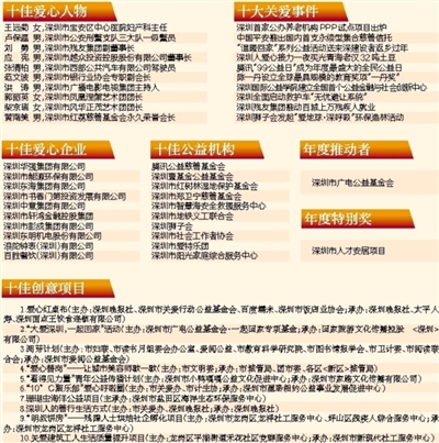 2017年1月3日,第十四屆深圳關(guān)愛行動(dòng)系列推選活動(dòng)正式啟動(dòng)。本次推選活動(dòng)經(jīng)過組織推薦或自薦、征求有關(guān)單位意見、初評(píng)會(huì)評(píng)審、公示、終評(píng)會(huì)評(píng)審等程序,最終推選出“十佳愛心人物”等獎(jiǎng)項(xiàng)。