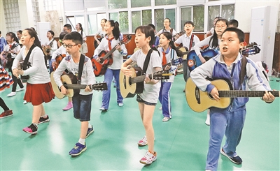 圖為該校學(xué)生們?cè)凇八狞c(diǎn)半活動(dòng)”中進(jìn)行吉他彈唱表演。