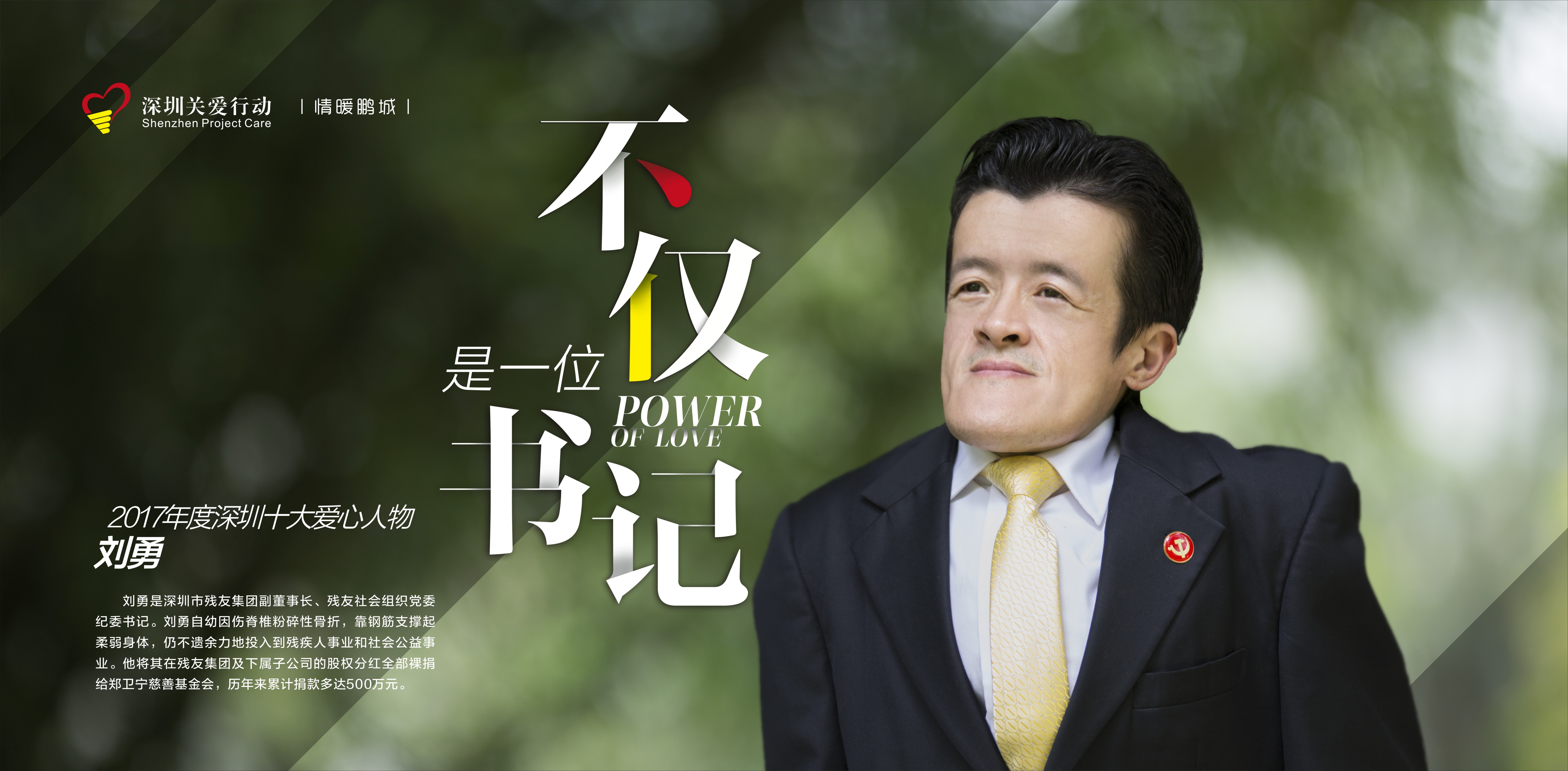男,深圳市殘友集團副董事長、殘友社會組織黨委紀委書記。自幼因傷脊椎粉碎性骨折,劉勇靠鋼筋支撐起柔弱身體,是中華殘疾人服務網(wǎng)、深圳市殘友集團、深圳市殘友動漫文化發(fā)展有限公司、喀什殘友科技有限公司創(chuàng)始人之一,殘友事業(yè)的開拓者。為促進殘疾人事業(yè)和社會公益事業(yè)的開拓發(fā)展,劉勇將其在殘友集團及下屬子公司的股權(quán)分紅全部裸捐給鄭衛(wèi)寧慈善基金會,歷年來累計捐款多達500萬元。他本人榮獲全國第七屆“中華慈善獎”、第十八屆“全國青年五四獎章”、“第五屆全國道德模范提名獎”、喀什建市60年10位優(yōu)秀人物、新疆喀什地區(qū)“十大杰出青年”和廣東省“優(yōu)秀共產(chǎn)黨員”等稱號。