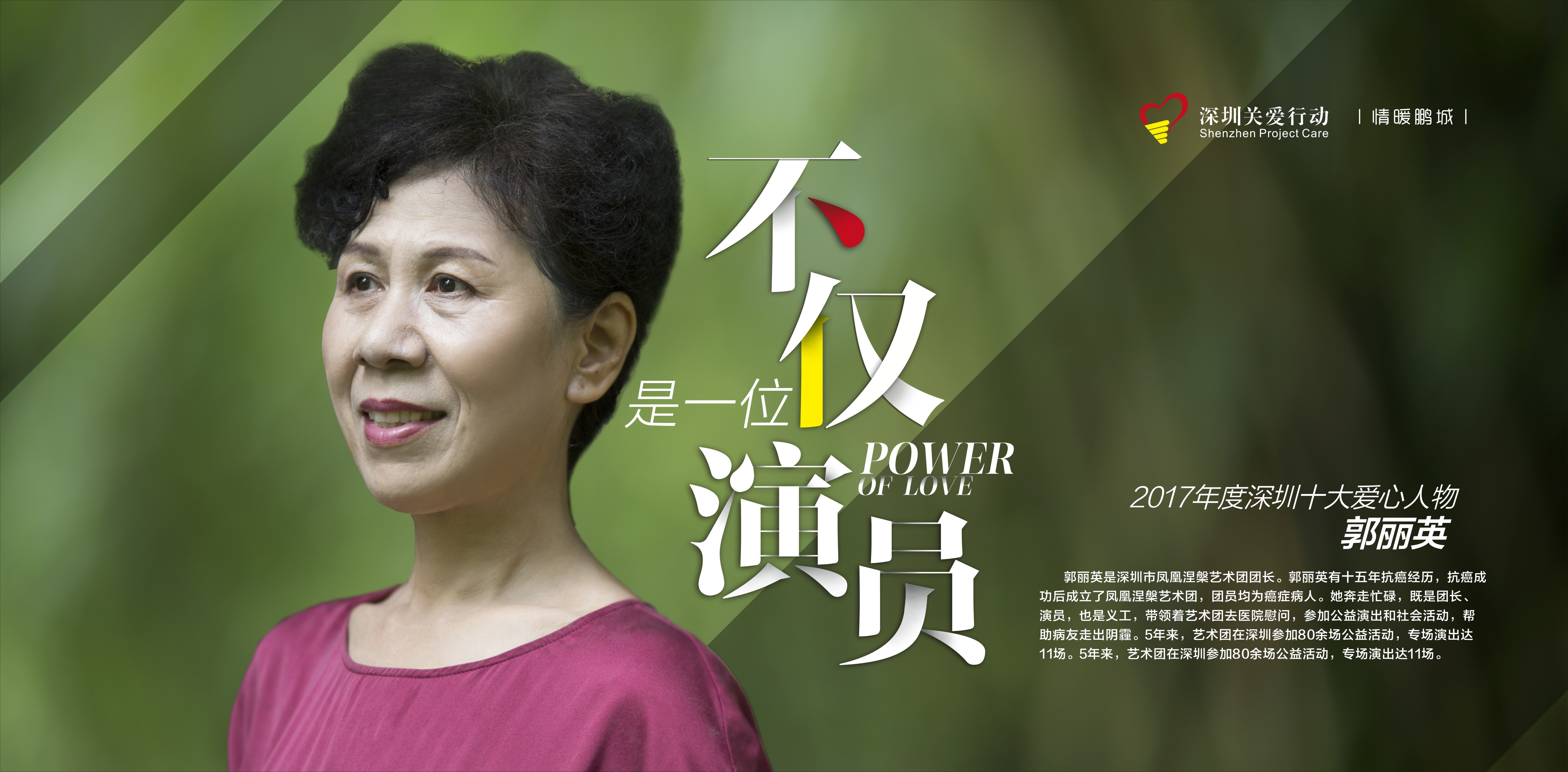 女,深圳市鳳凰涅槃藝術團團長。郭麗英有十五年抗癌經(jīng)歷,2002年抗癌成功后,在叢飛的鼓勵下,她成立了鳳凰涅槃藝術團,創(chuàng)辦了一個由一百多名癌癥病人組成的特殊藝術團。她拾起了自己的小提琴,走上舞臺,鼓勵癌友抗癌,重新用藝術點亮生命。為了給新老病友帶來快樂,警示世人珍惜生命,她奔走忙碌,既是團長、演員還是義工,帶領藝術團將各種真實故事以藝術形式演繹,通過去醫(yī)院慰問、參加公益演出和社會活動,幫助病友走出陰霾,足跡遍布全國的大江南北。藝術團成立近5年來,在深圳參加80余場次各類社會公益活動,專場演出已達11場。她本人也被授予全國“十大巾幗”、騰訊《共鳴》年度人物等多項榮譽稱號。