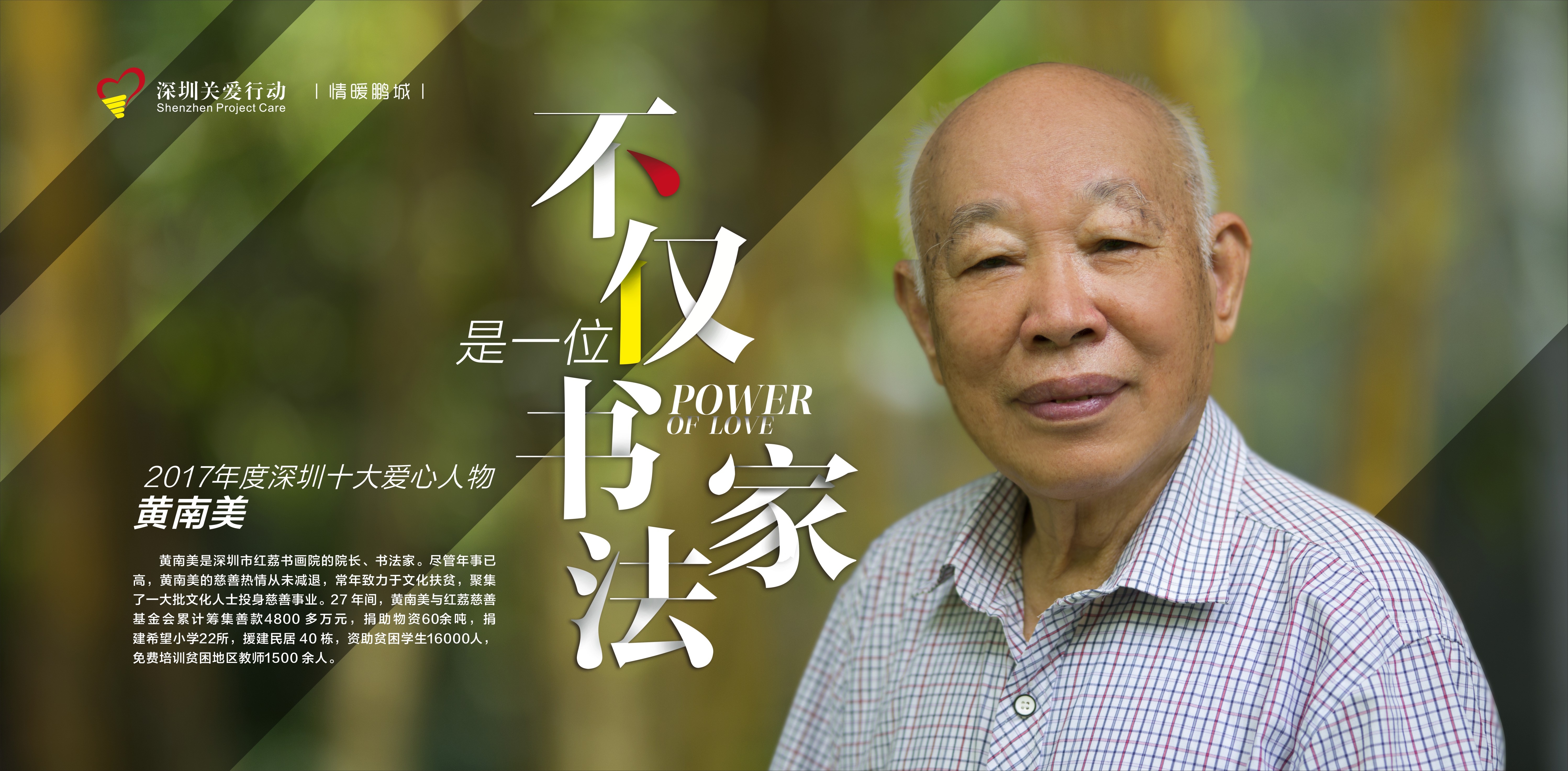 男,深圳市紅荔慈善基金會永久榮譽會長。年已九十歲高齡的黃南美老人,1989年創(chuàng)辦深圳市第一個民辦社會文化機構——紅荔書畫館,積極參與深圳特區(qū)文化建設的同時,開創(chuàng)了一條文化扶貧的新路,團結了一大批愛心書畫家、 企業(yè)家和愛心人士參與到公益慈善事業(yè)。他把自己當作慈善路上的“拾柴人”,要把散落在社會上愛心的“干柴”,匯集起來,讓它們發(fā)出更大的光和熱。27 年來,從紅荔書畫館到紅荔慈善基金會,黃南美與紅荔慈善基金會累計籌集扶貧助學善款近4800 多萬元,捐助物資近60余噸,捐建希望小學22所,援建民居 40 棟,資助貧困學生1.6 萬人,免費培訓貧困地區(qū)教師1500 余人。他被評為全國公益事業(yè)杰出先進個人、中國改革開放30年百名杰出人物、鵬城慈善獎十大杰出人物等。