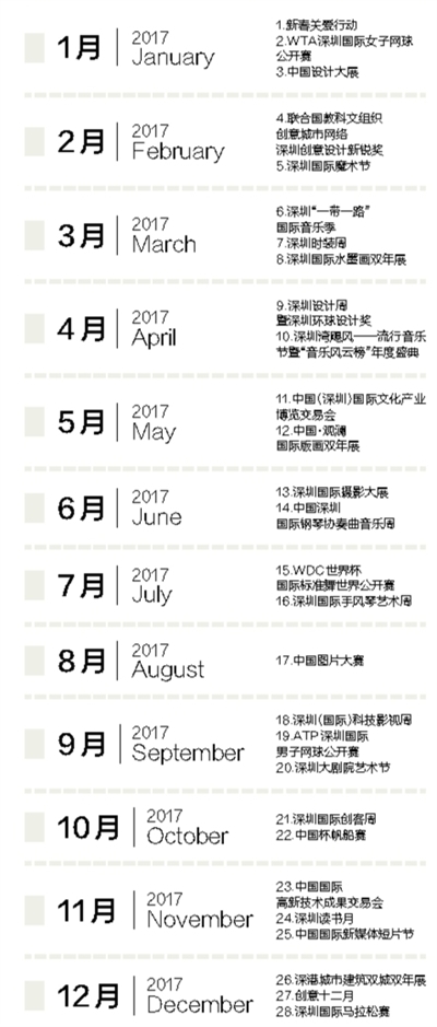 據(jù)了解,這份“菜單”共收錄了國際化、標(biāo)志性的品牌文化活動28項,活動都由國際或國家權(quán)威專業(yè)機(jī)構(gòu)主辦或授權(quán),不少活動代表了我國對應(yīng)領(lǐng)域的最高水準(zhǔn),是可以代表深圳國際化城市形象的“文化大餐”。