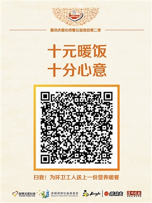 只要輕輕掃碼,捐出十元錢,就能實(shí)現(xiàn)隨手公益,圓環(huán)衛(wèi)工人一頓“暖飯”的心愿。據(jù)悉,此次公益活動(dòng)所捐款項(xiàng)將進(jìn)入美麗深圳公益基金會(huì),全部用于關(guān)愛(ài)環(huán)衛(wèi)工人愛(ài)心待餐項(xiàng)目。那就別再猶豫啦,快快掃碼加入暖飯派送使者的隊(duì)伍吧?。ㄍ醪?/p>