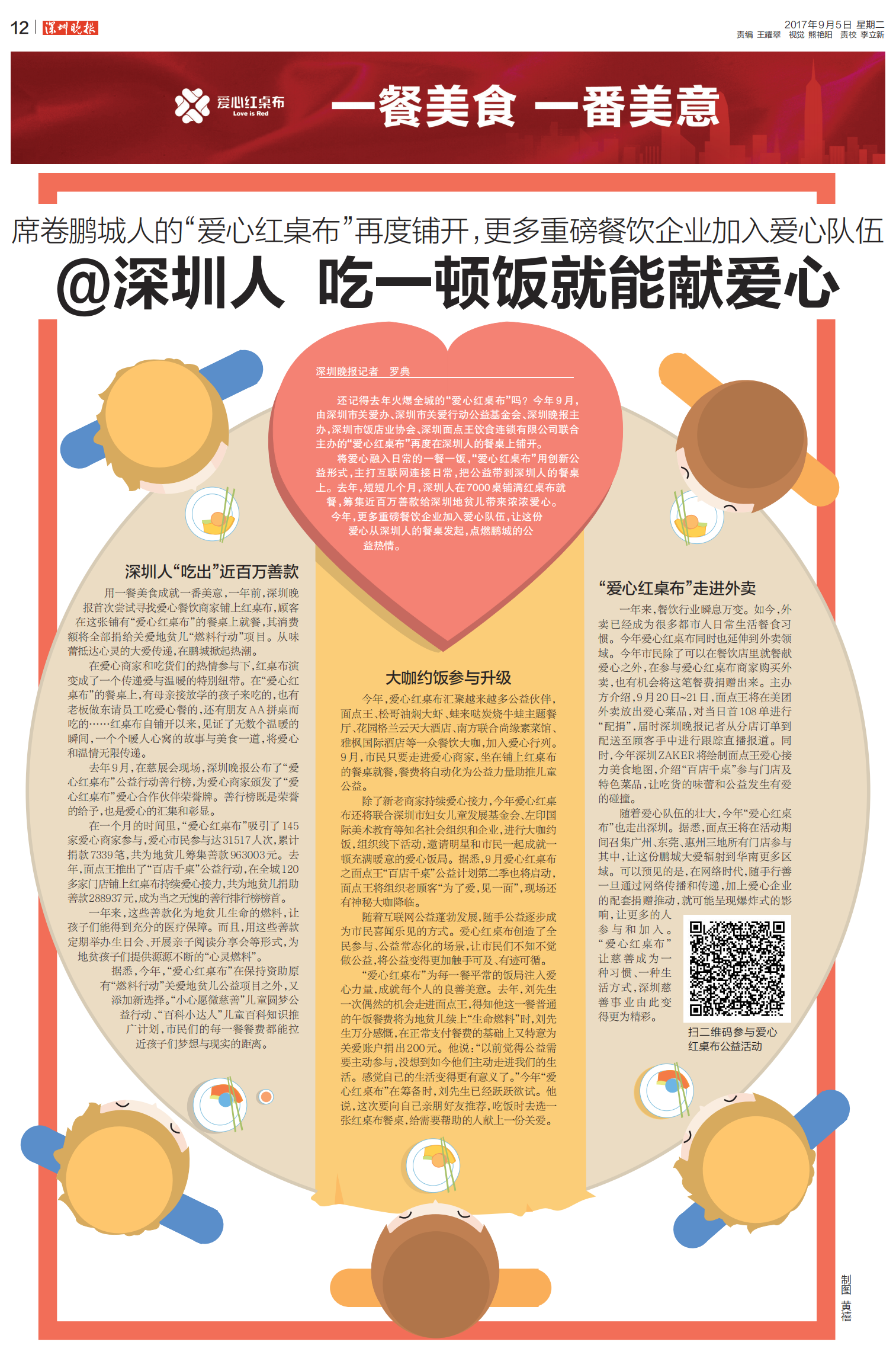 還記得去年火爆全城的“愛心紅桌布”嗎?今年9月,由深圳市關(guān)愛辦、深圳市關(guān)愛行動公益基金會、深圳晚報主辦,深圳市飯店業(yè)協(xié)會、深圳面點王飲食連鎖有限公司聯(lián)合主辦的“愛心紅桌布”再度在深圳人的餐桌上鋪開。