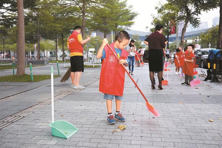 清晨5點(diǎn)多,晨曦微露,百余位熱心的小志愿者就陸續(xù)來(lái)到了福田區(qū)、羅湖區(qū)、南山區(qū)的活動(dòng)現(xiàn)場(chǎng)。他們?nèi)齼沙山M,分工明確,有的負(fù)責(zé)清掃,有的負(fù)責(zé)清運(yùn)。在中心書城活動(dòng)現(xiàn)場(chǎng),一位小志愿者用夾子將花池邊的煙頭一個(gè)個(gè)夾進(jìn)垃圾袋;一位小男孩細(xì)心地用手將嵌進(jìn)地磚縫的牙簽、果殼摳出。5歲男孩冀泓琿拿著比自己還高的掃帚,在爸爸的指導(dǎo)下將落葉掃進(jìn)簸箕;7歲的玄梓涵麻利地清掃著垃圾,不一會(huì)兒就把媽媽落在了后面?;顒?dòng)從5點(diǎn)持續(xù)到7點(diǎn)半,幾條路清掃下來(lái),小志愿者們額頭上冒出了汗珠,汗水濕透了衣衫。