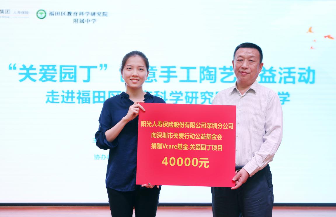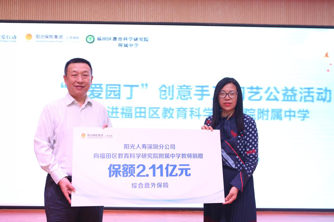 作為本次“關(guān)愛園丁”活動(dòng)的主辦方之一,陽光人壽深圳分公司不僅為福田區(qū)教科院附中的每位老師送去了百萬保額的意外險(xiǎn),同時(shí)還向深圳市關(guān)愛行動(dòng)公益基金會(huì)Vcare基金·關(guān)愛園丁項(xiàng)目捐贈(zèng)了4萬元愛心善款。