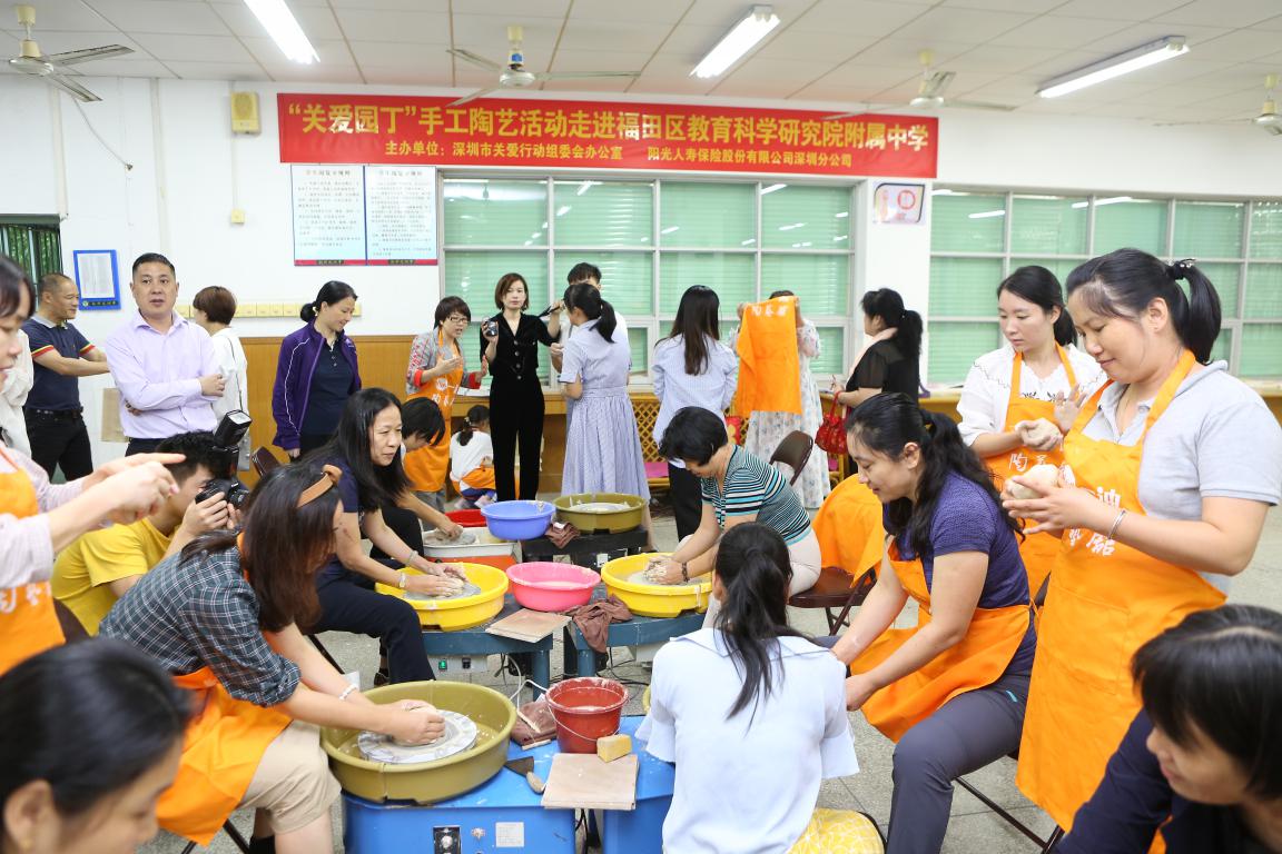 深圳新聞網(wǎng)訊 為踐行社會(huì)主義核心價(jià)值觀,持續(xù)樹立“關(guān)愛、感恩、回報(bào)”的城市品格,真正將關(guān)愛園丁的活動(dòng)落在實(shí)處,10月15日,深圳市關(guān)愛行動(dòng)組委會(huì)辦公室(簡(jiǎn)稱“深圳市關(guān)愛辦”)聯(lián)手陽光人壽深圳分公司走進(jìn)愛心學(xué)?!L飬^(qū)教科院附屬中學(xué)(以下簡(jiǎn)稱“教科院附中”),舉辦了一場(chǎng)“關(guān)愛園丁”創(chuàng)意手工陶藝公益活動(dòng)?;顒?dòng)為該校的98位老師每人贈(zèng)送一份為期一年的人身意外保險(xiǎn),保額共計(jì)2.11億元,并為老師們送上了一場(chǎng)輕松的創(chuàng)意手工陶藝活動(dòng)。
