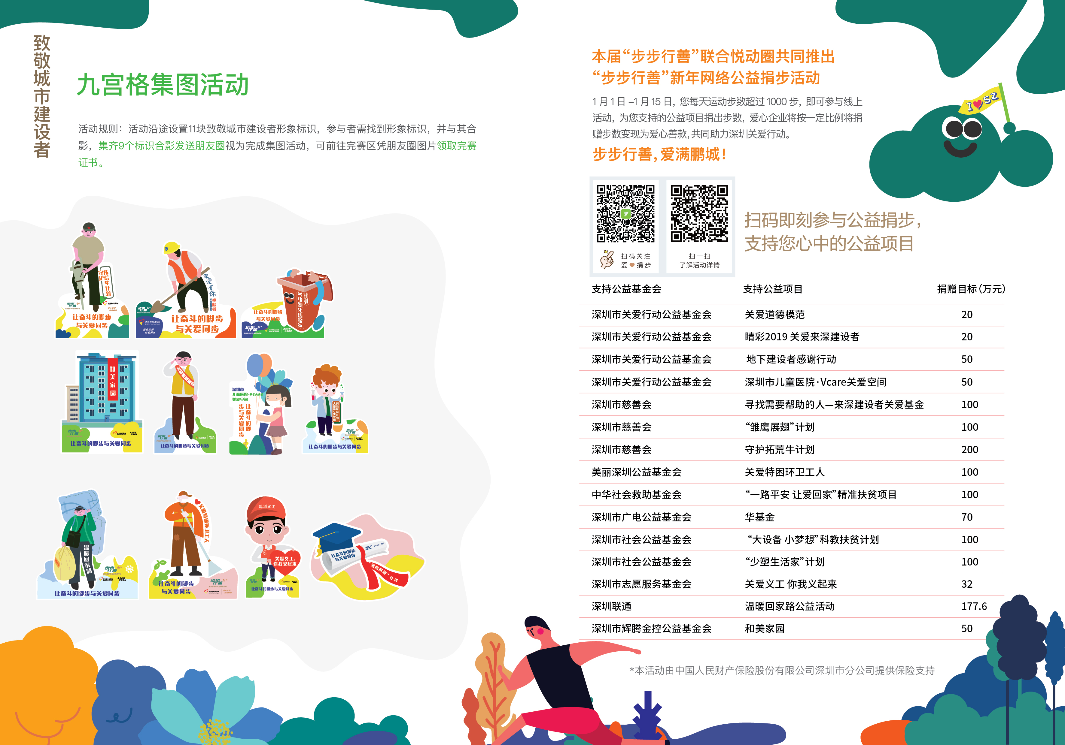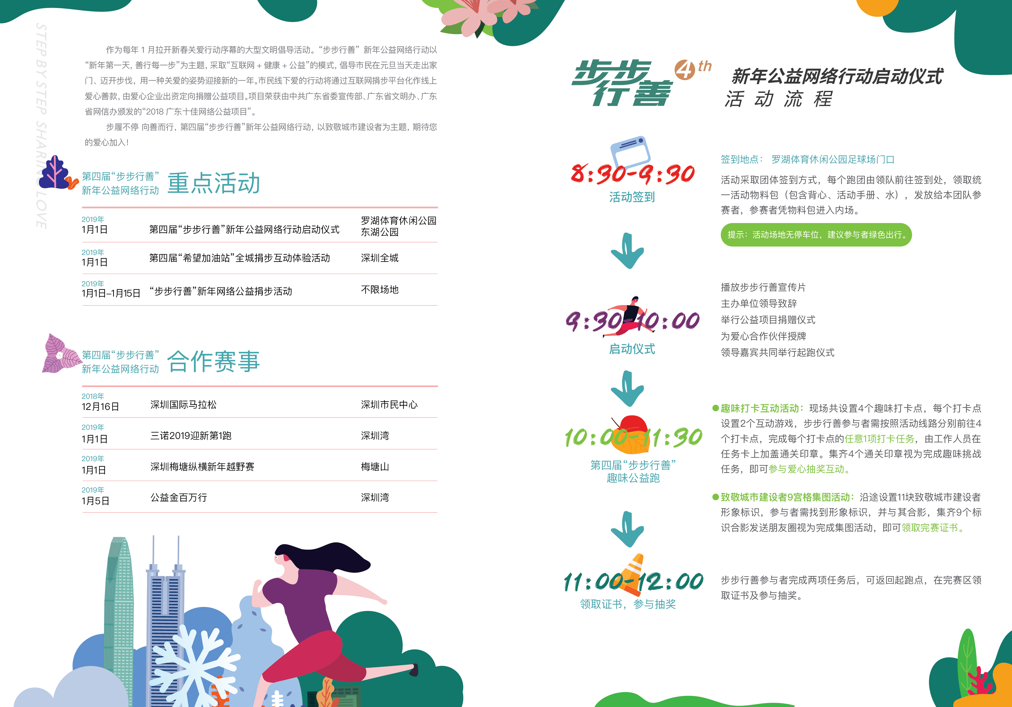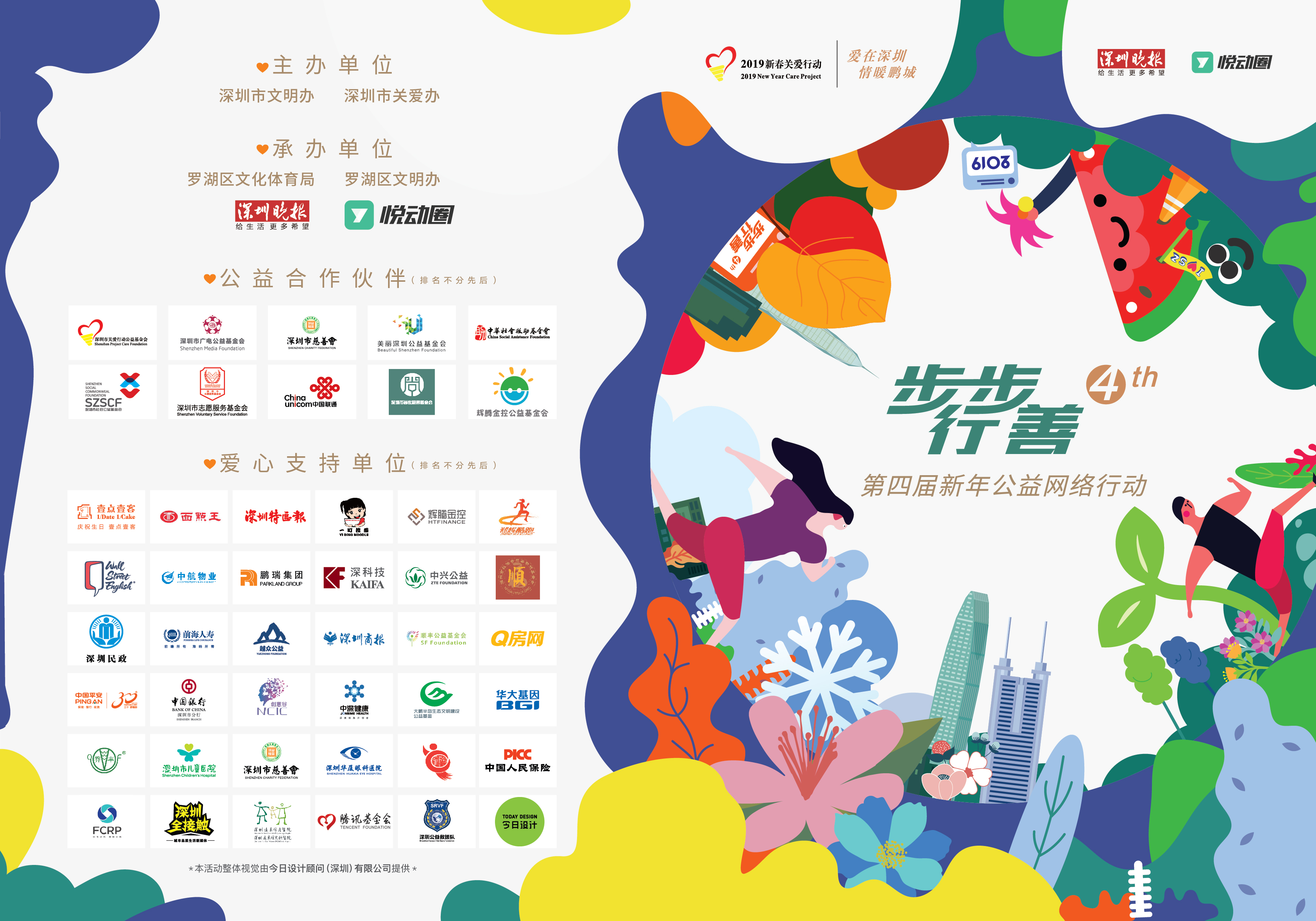 2019年1月1日上午,由深圳市文明辦、深圳市關(guān)愛辦主辦,羅湖區(qū)文化體育局、羅湖區(qū)文明辦、深圳晚報社、悅動圈承辦的“步步行善”第四屆深圳新年公益網(wǎng)絡(luò)行動在羅湖體育休閑公園啟動,并以此為標(biāo)志,在全市范圍啟動2019新春關(guān)愛行動。該活動倡導(dǎo)“新年第一天、善行每一步”,動員廣大市民步履不停、向善而行,以捐贈步數(shù)的方式為關(guān)愛項(xiàng)目籌款,向?yàn)楦母镩_放和城市發(fā)展作出貢獻(xiàn)的建設(shè)者表達(dá)敬意。