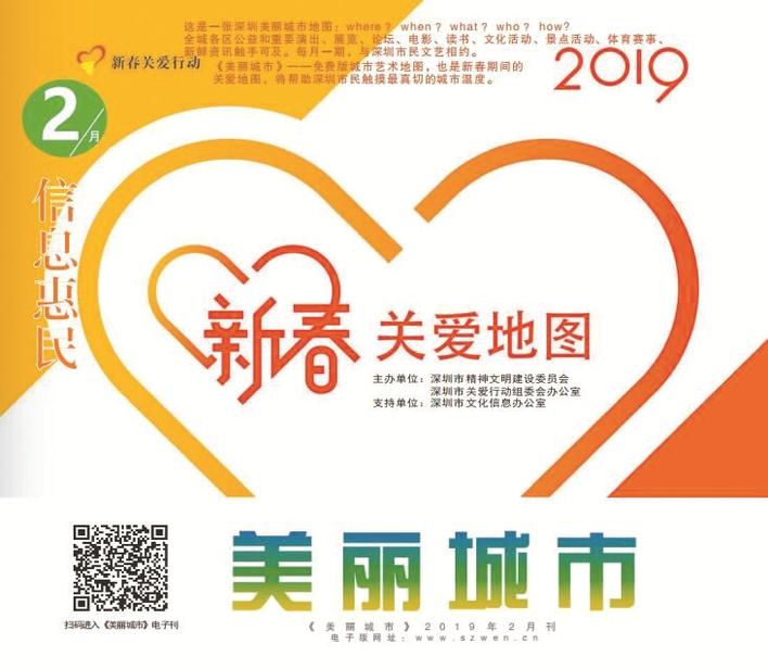 1月28日,由深圳市關(guān)愛辦聯(lián)合市文體旅游局推出的“2019新春關(guān)愛地圖”正式推出。該項(xiàng)目作為2019新春關(guān)愛行動(dòng)文化福利板塊的重點(diǎn)項(xiàng)目,已連續(xù)推出兩年。今年,新春關(guān)愛地圖再次帶著全市百余項(xiàng)適合市民參與的活動(dòng)資訊而來,不僅有新春關(guān)愛行動(dòng)七大板塊“感恩慰問”“溫暖回家”“在深過年”“文化福利”“網(wǎng)絡(luò)公益”“精準(zhǔn)扶貧”“志愿服務(wù)”的重點(diǎn)關(guān)愛活動(dòng),還有大量文化、旅游、電影、講座、展覽等資訊。