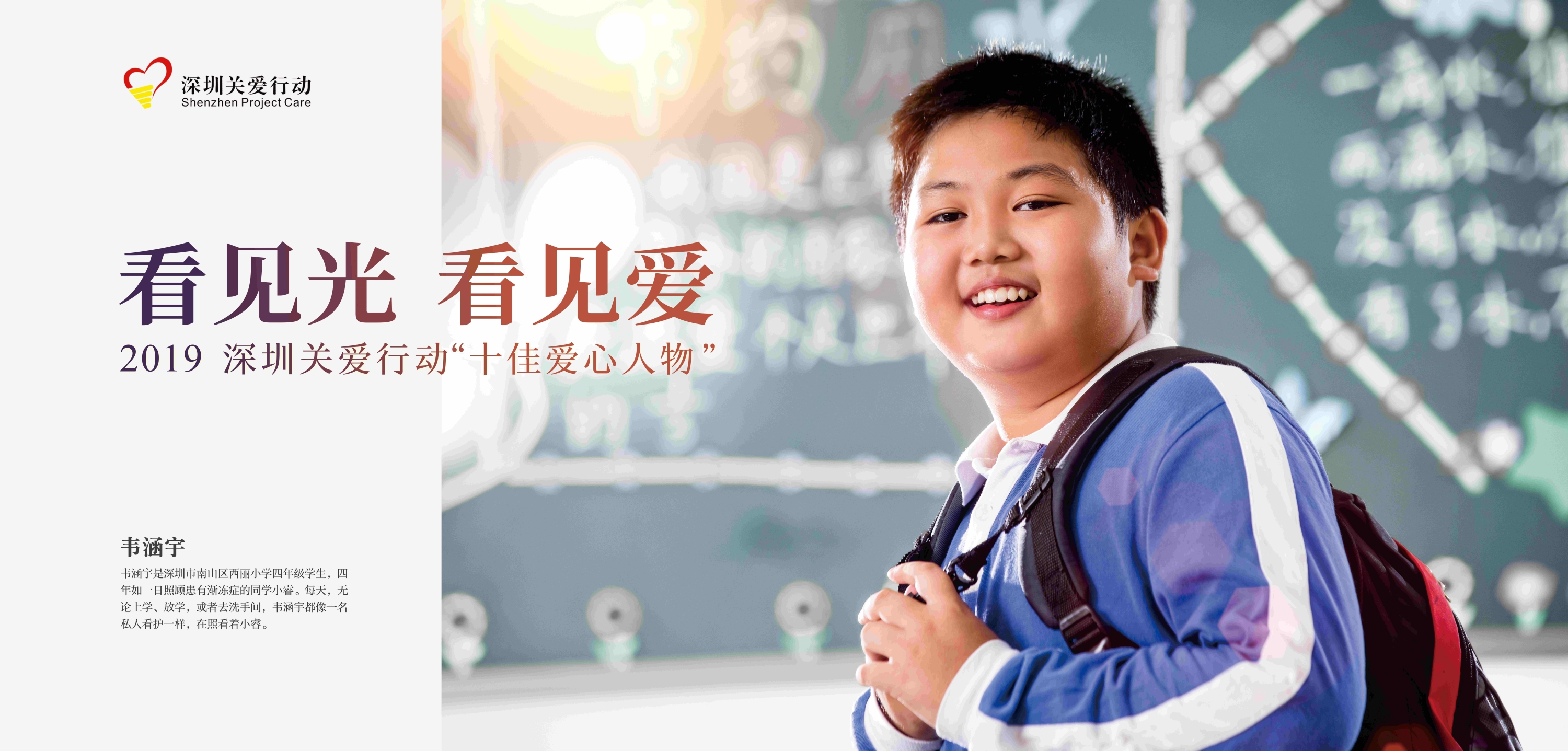 男,深圳市南山區(qū)西麗小學學生。韋涵宇同學四年如一日地照顧患有漸凍癥的同學小睿。