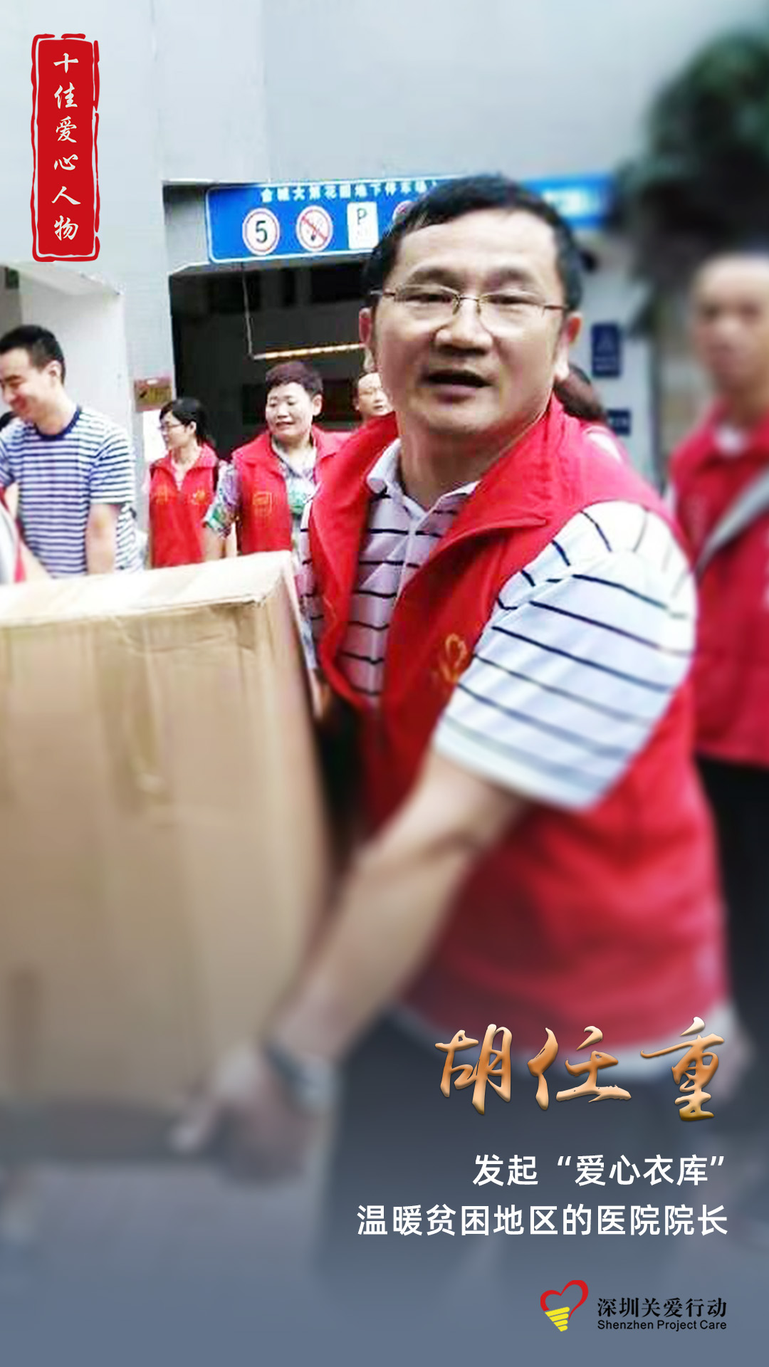 胡任重,深圳市光明區(qū)婦幼保健院副院長。從2008年至今,每年“全國助殘日”,組織深圳獅子會、企業(yè)家為光明職康中心殘疾人購買殘疾人手工藝品,共計40余萬元。從2013年至今,每年組織義診專家團隊到廣東陸河、深圳大鵬及光明各社區(qū)為環(huán)衛(wèi)工人等進行義診,總計1000余次。2014年成立“光明區(qū)愛心扶貧一幫一助學(xué)公益群”,已累計資助了102名貧困學(xué)生,其中胡任重一家資助了13名貧困學(xué)生。2013年發(fā)起成立農(nóng)工黨光明直屬支部“愛心衣庫”,每年向邊遠地區(qū)進行捐贈活動,先后籌措40萬元采購了220箱御寒衣服和4箱圖書文具,分別送給青海、四川、西藏等地的老人院、孤兒院和貧困地區(qū)。
