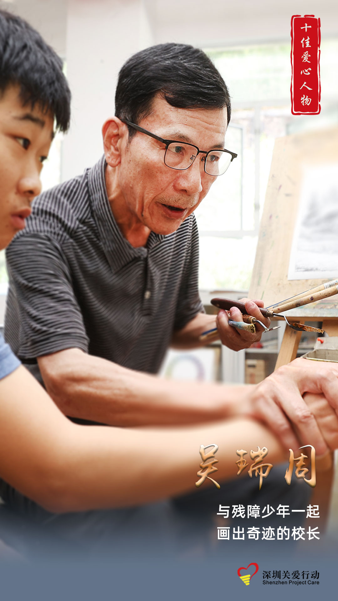 吳瑞周,深圳市愛心美術(shù)職業(yè)培訓(xùn)學(xué)校校長。他自學(xué)繪畫白手起家,事業(yè)有成后,創(chuàng)辦公益美術(shù)學(xué)校,為此他投入了全部財(cái)產(chǎn),子女大學(xué)畢業(yè)后也都加入他的公益辦學(xué)。20年來,他培育了200余名生活在社會(huì)邊緣的殘障人士學(xué)得一技之長,重拾自信。在抗疫期間,他竭盡全力組織教師開展線上會(huì)議,鼓勵(lì)教師落實(shí)線上教學(xué)交流工作,并及時(shí)了解特殊學(xué)生在家的思想與學(xué)習(xí)情況。2020年3月,吳瑞周與師生聯(lián)合吉華街道婦聯(lián)特別推出《“致敬巾幗英雄——最美逆行者”系列優(yōu)秀“抗疫”作品展》,用畫筆記錄防疫過程的吉華故事,用藝術(shù)致敬抗疫一線的女性工作者。
