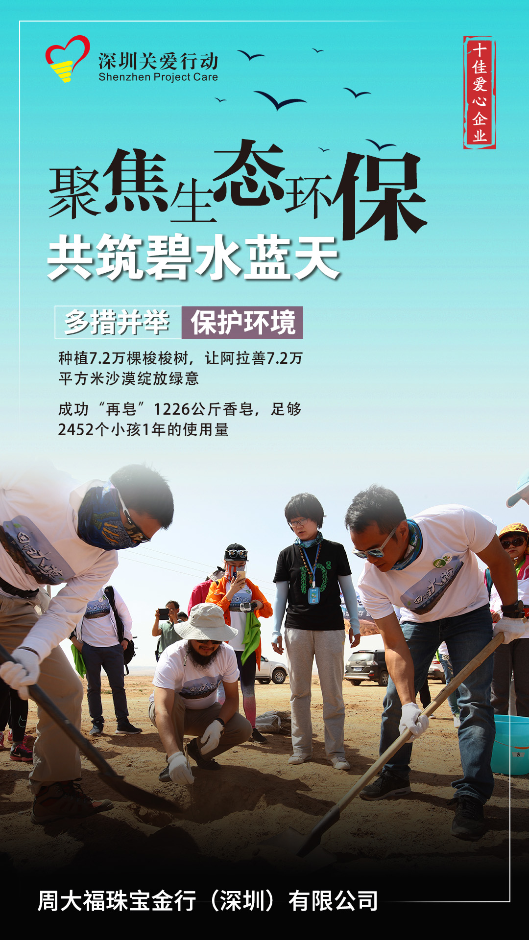 周大福珠寶金行(深圳)有限公司于2016年與阿拉善SEE基金會(huì)合作,5年間在阿拉善種植超過7.2萬棵梭梭樹,覆蓋超過72000平方米的沙漠,為阿拉善增添了一抹綠;通過利用回收及再造未消耗的肥皂進(jìn)行“再皂”,成功再皂1226公斤香皂,足夠2452個(gè)小孩1年的使用量。