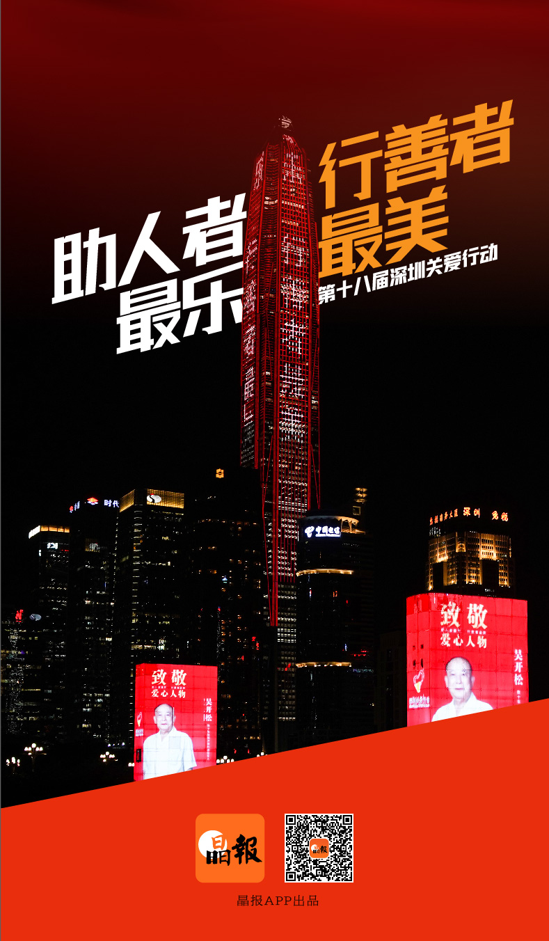 近日,第十八屆深圳關愛行動系列推選獲獎名單揭榜,全城地標為愛心亮燈," 助人者最樂,行善者最美 "" 愛在深圳,情暖鵬城 "" 向第十八屆愛心典范致敬 " 等標語在京基 100 大廈、地王大廈、深圳灣一號等建筑不斷滾動。