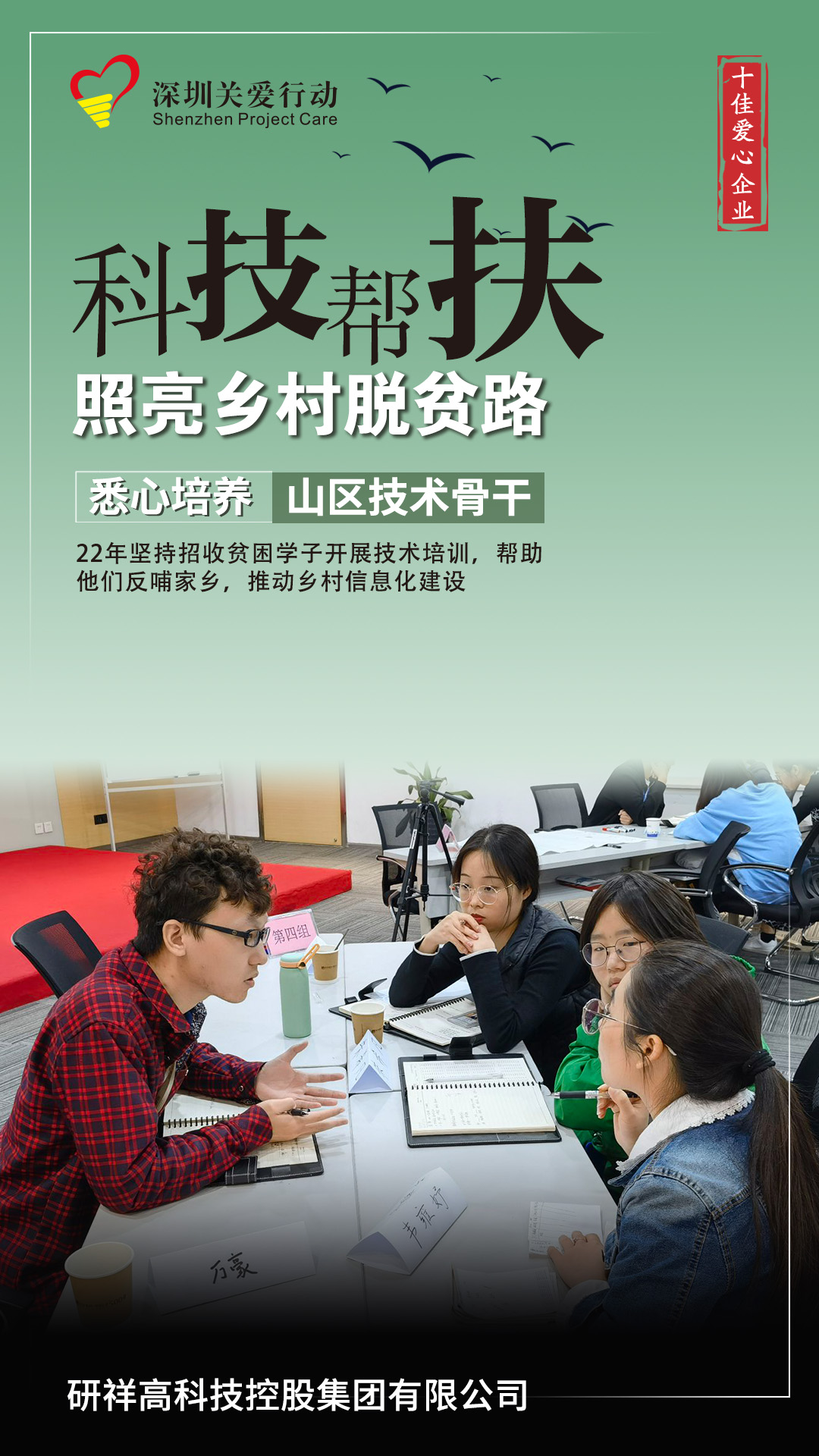 研祥集團(tuán)堅持參加社會公益事業(yè)和扶貧工作,從1999年至今,每年招收數(shù)十名來自廣東東源縣、廣西梧州、河南蘭考縣等地區(qū)因貧困未能考取大學(xué)的青年學(xué)生,到集團(tuán)接受設(shè)計技術(shù)專業(yè)的公益培訓(xùn),授之以漁,使他們掌握相關(guān)技能之后,回鄉(xiāng)成為當(dāng)?shù)丶夹g(shù)骨干并帶動當(dāng)?shù)匦畔⒒ㄔO(shè)發(fā)展。