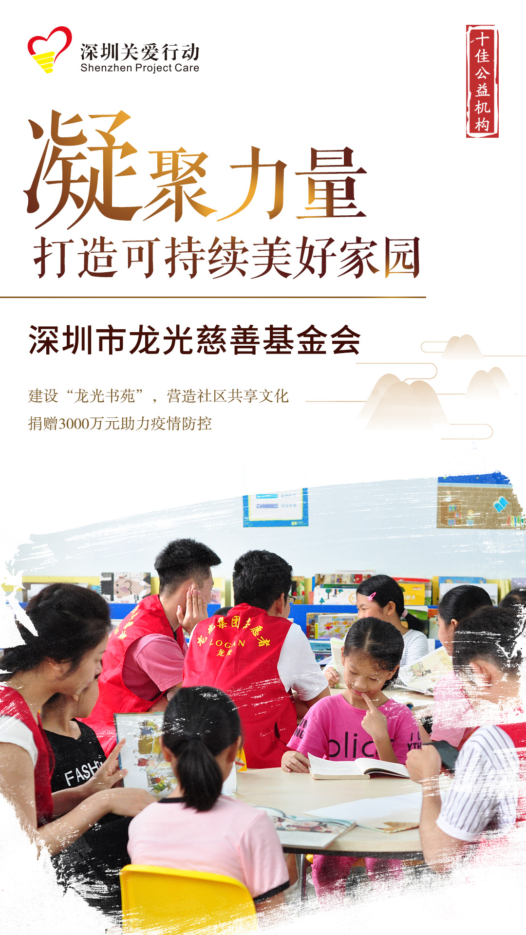 龍光慈善基金會(huì)成立于2016年,定位以扶貧為主,教育和社區(qū)為兩翼,人人公益(志愿服務(wù))為企業(yè)精神,致力打造可持續(xù)的美好家園。歷年開展公益項(xiàng)目30余個(gè),累計(jì)捐贈(zèng)21724.8萬元。其中,在抗擊新冠肺炎疫情中捐贈(zèng)3000萬元用于支援湖北、廣東等地的疫情防控。為營造社區(qū)共享文化,發(fā)起“龍光書苑”社區(qū)營造項(xiàng)目,為社區(qū)居民免費(fèi)提供閱讀、課業(yè)輔導(dǎo)、手工制作、自然教育的公共交流空間,目前已有書苑10間。2020年,志愿者們積極參與抗疫防疫、環(huán)保、探訪等公益行動(dòng),累計(jì)參與9869人次,服務(wù)時(shí)間超19738小時(shí),展現(xiàn)出龍光良好的企業(yè)文化和人人參與公益的企業(yè)精神。