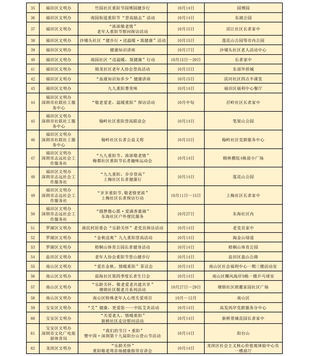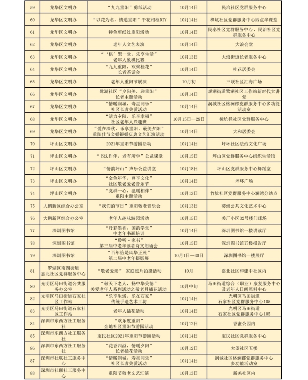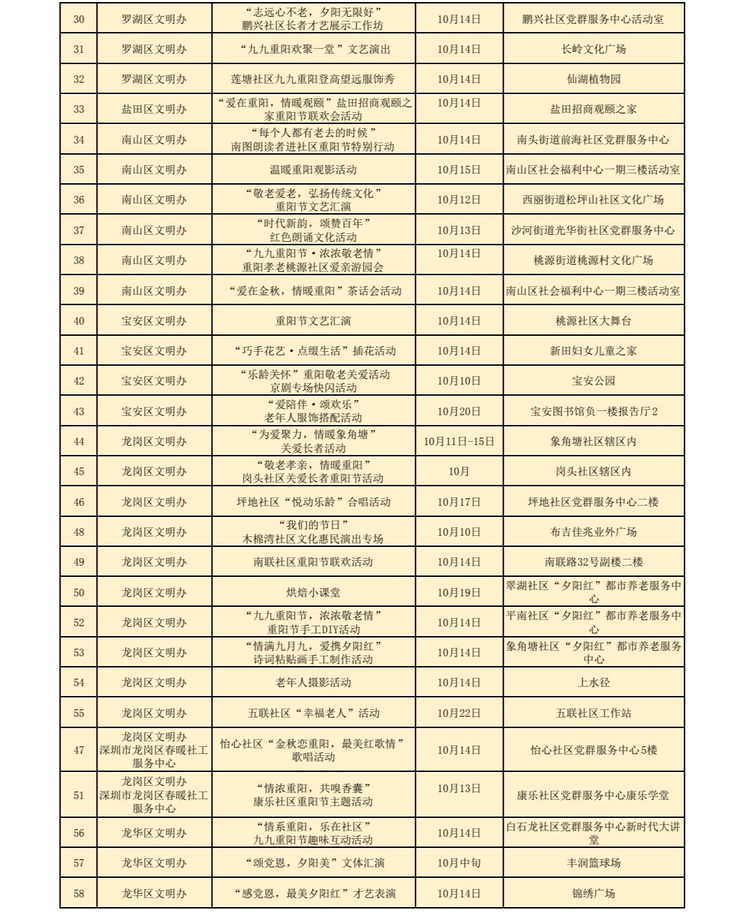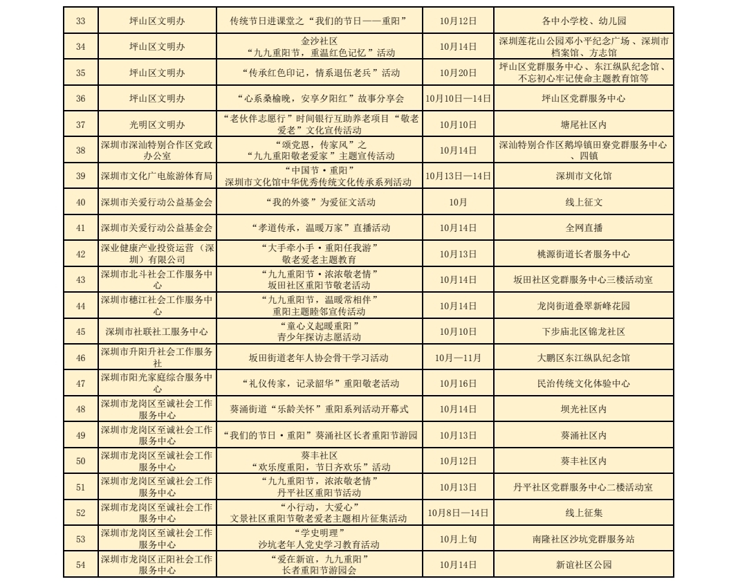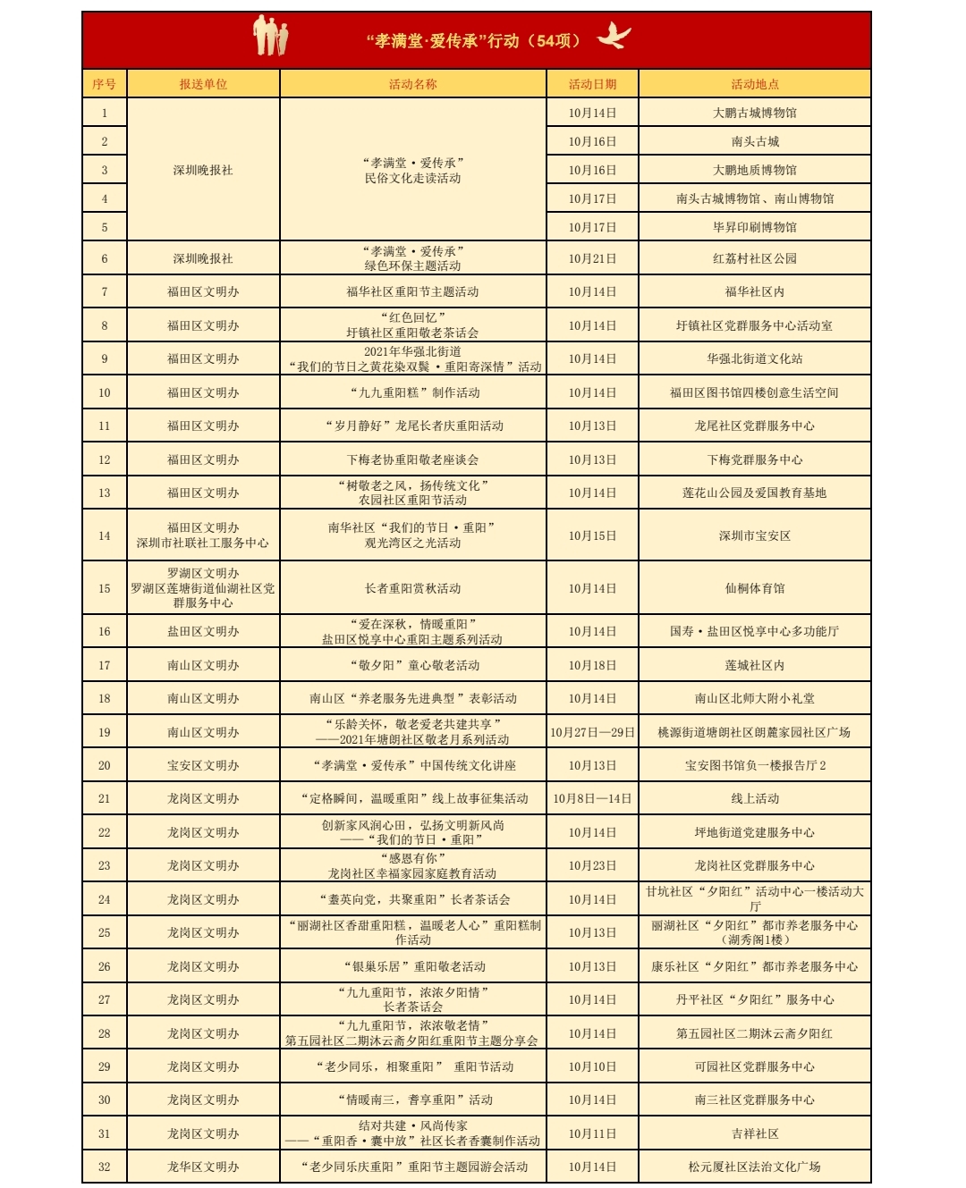 此外,深圳圖書館的“銀發(fā)閱讀”文化關(guān)愛項(xiàng)目、深圳晚報(bào)的“孝滿堂·愛傳承”民俗文化走讀活動(dòng)、深圳市愛心與共幸福促進(jìn)中心的“樂齡聽書”心理健康網(wǎng)課活動(dòng)、福田區(qū)非遺主題館的“金秋十月”非遺生活美學(xué)堂活動(dòng)也將在重陽敬老周期間陸續(xù)開展,讓老年人擁有健康、快樂和豐富多彩的晚年生活。