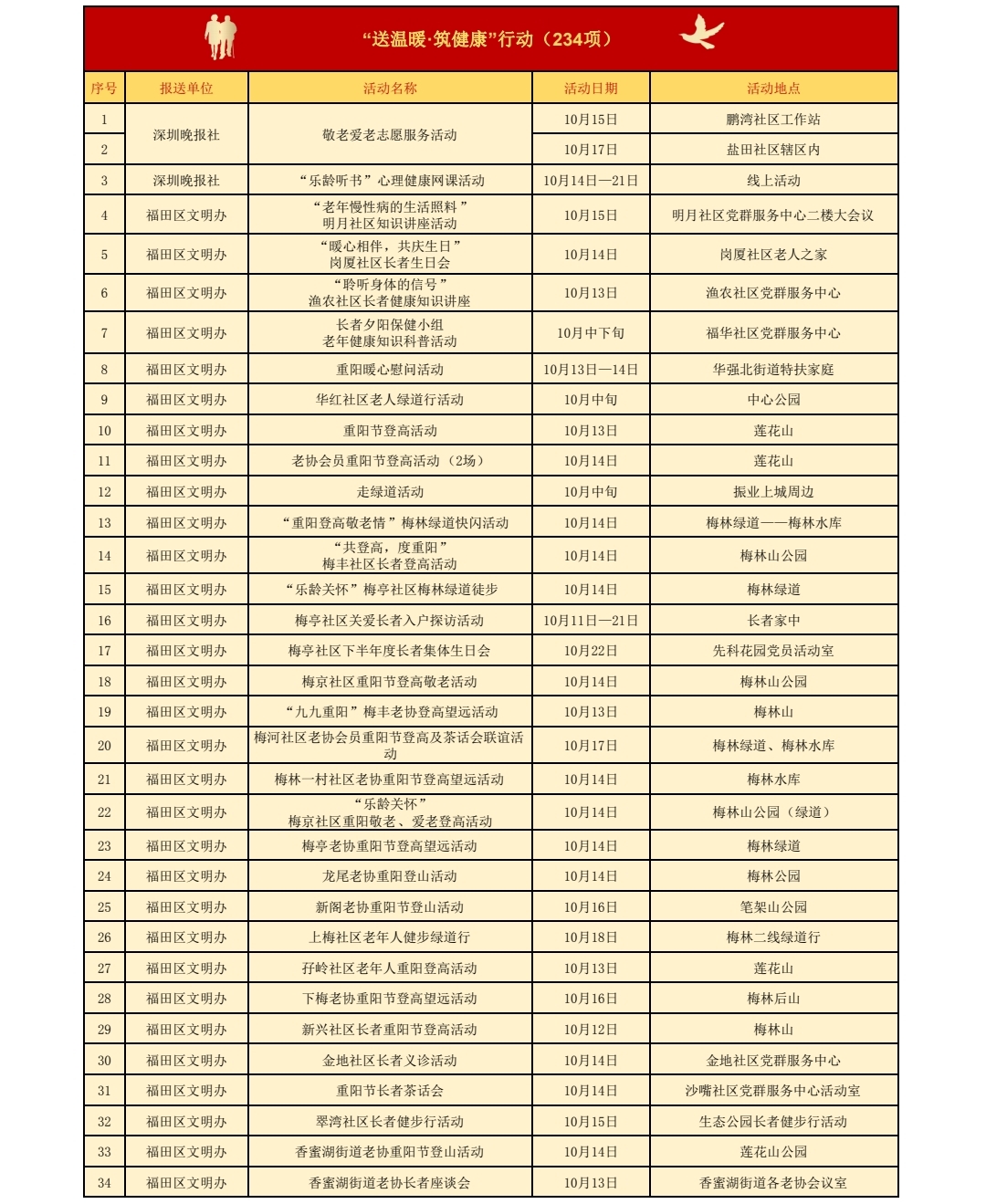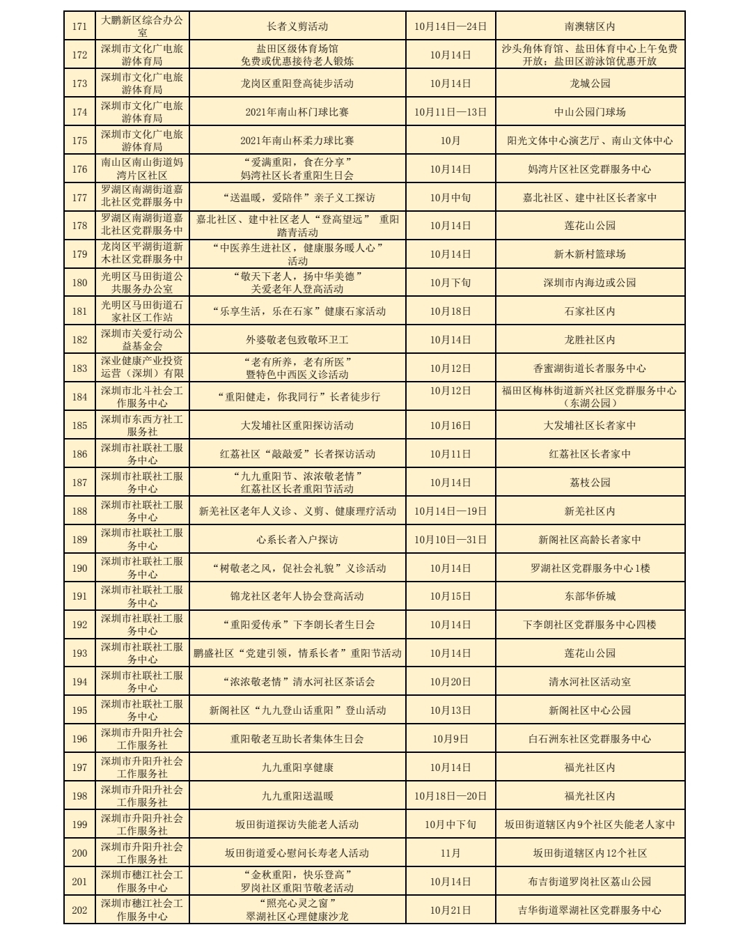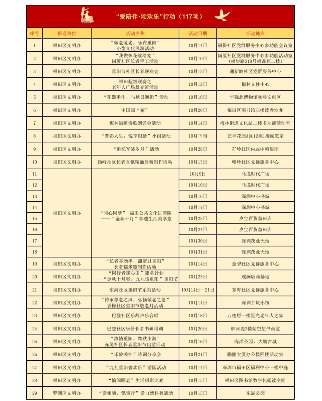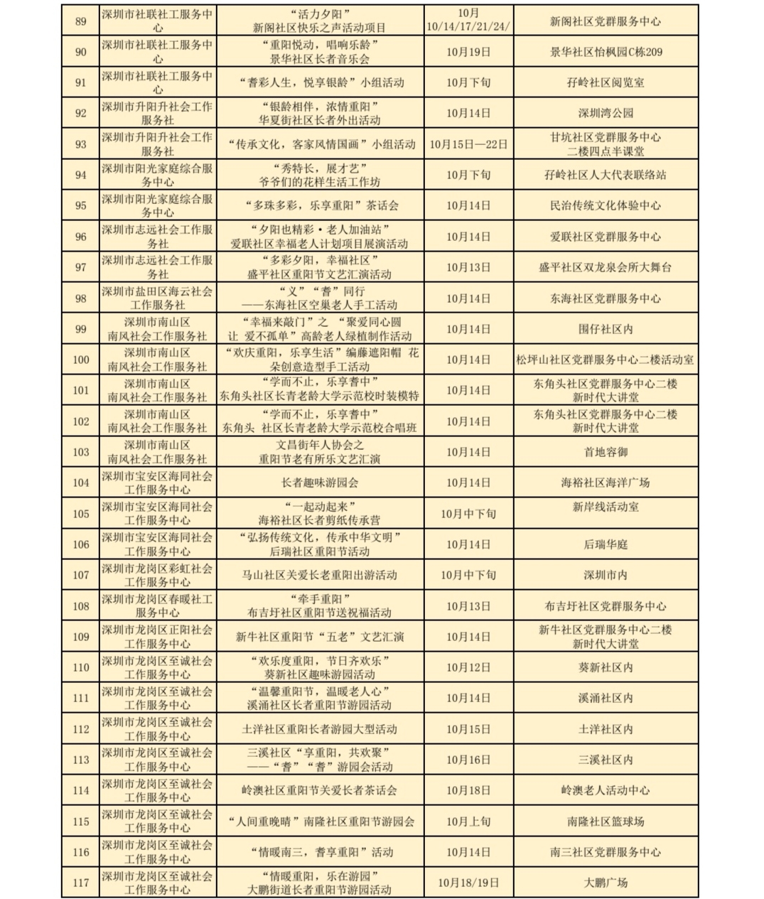 此外,深圳圖書館的“銀發(fā)閱讀”文化關(guān)愛項(xiàng)目、深圳晚報(bào)的“孝滿堂·愛傳承”民俗文化走讀活動(dòng)、深圳市愛心與共幸福促進(jìn)中心的“樂齡聽書”心理健康網(wǎng)課活動(dòng)、福田區(qū)非遺主題館的“金秋十月”非遺生活美學(xué)堂活動(dòng)也將在重陽敬老周期間陸續(xù)開展,讓老年人擁有健康、快樂和豐富多彩的晚年生活。
