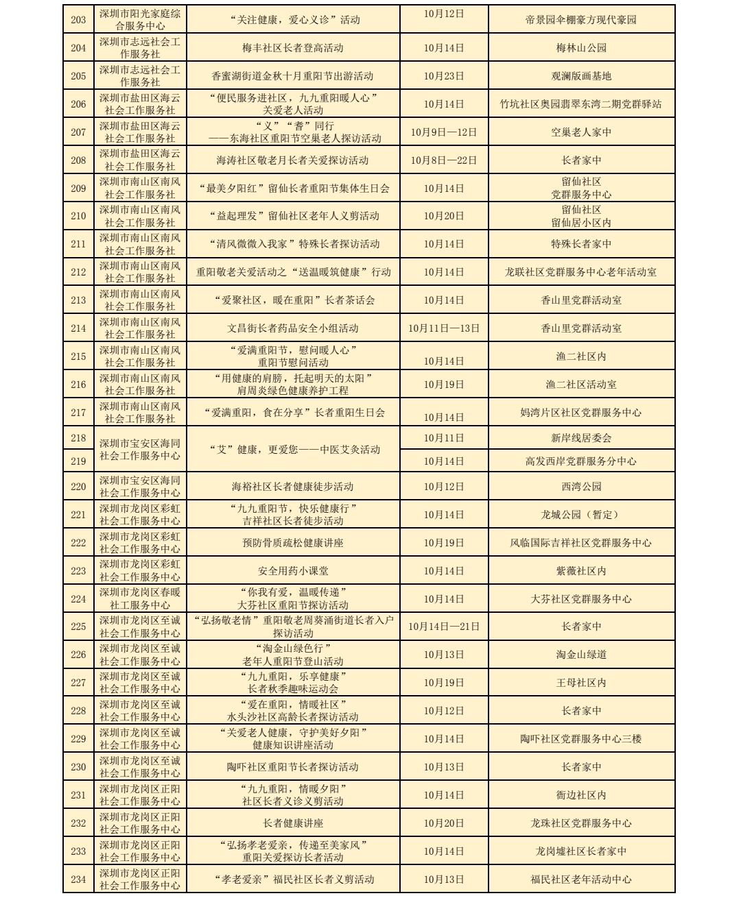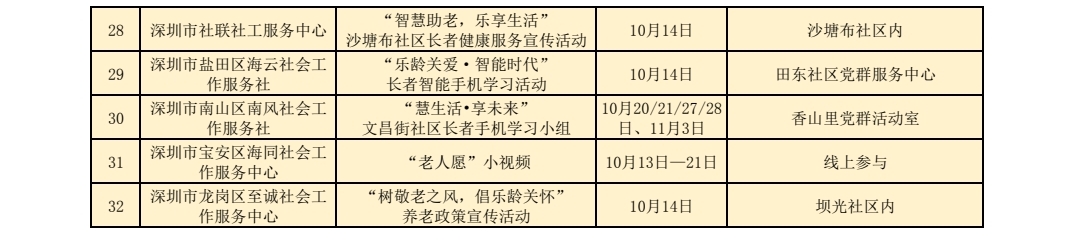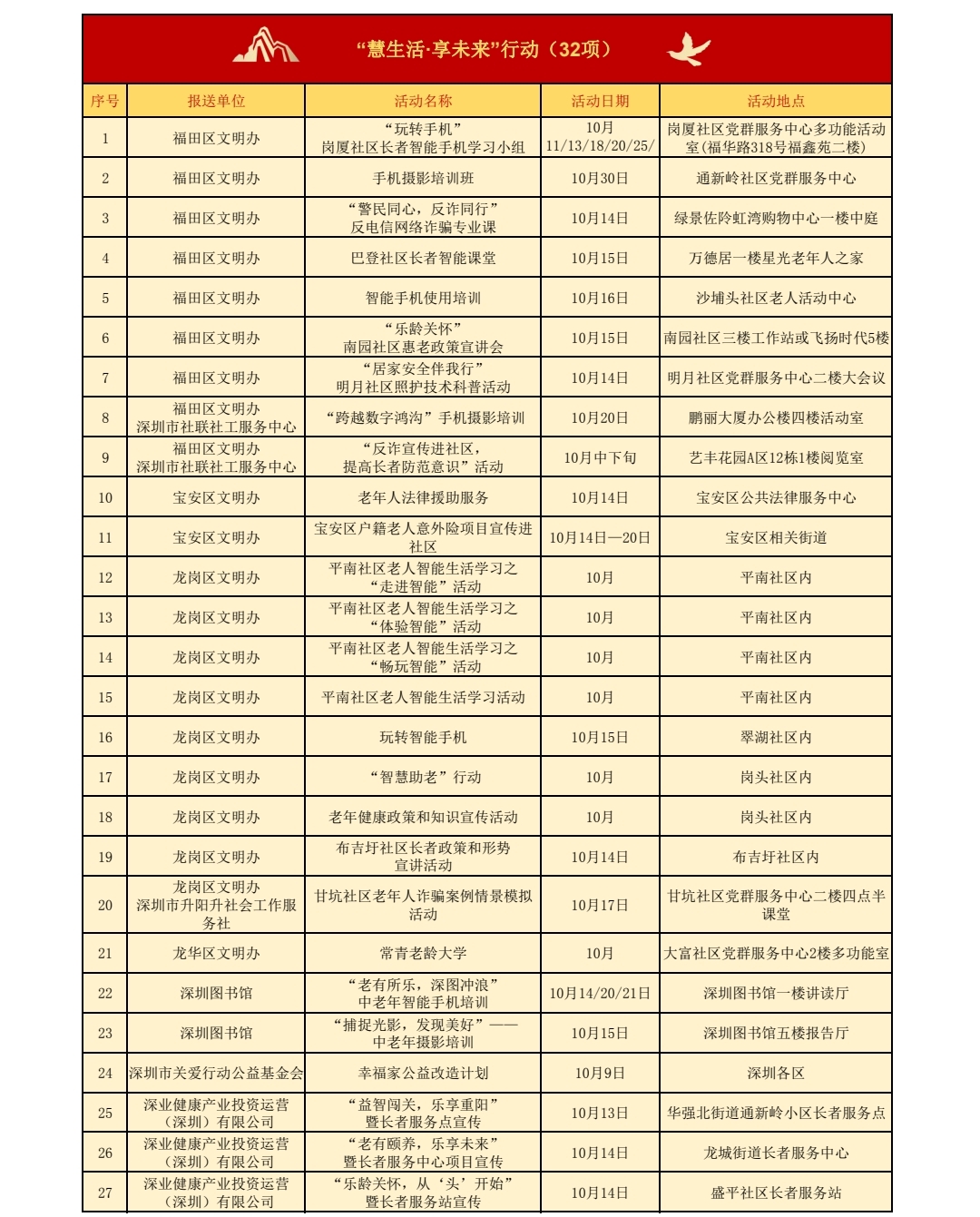 10月11日,由深圳市文明辦、深圳市關(guān)愛辦主辦的深圳關(guān)愛行動(dòng)“樂齡關(guān)懷“重陽敬老周正式啟動(dòng)。本次活動(dòng)由市文明辦、市關(guān)愛辦聯(lián)合各區(qū)各單位結(jié)合本轄區(qū)的工作特點(diǎn)和實(shí)際情況,策劃了內(nèi)容充實(shí)形式多樣、具有一定創(chuàng)新性的主題活動(dòng),其中,十大關(guān)愛活動(dòng)將讓老年人老有所樂: