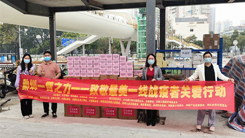 深圳市關(guān)愛行動公益基金會迅速行動,聯(lián)合公益伙伴、愛心企業(yè)迅速籌集關(guān)愛物資。本來生活網(wǎng)捐贈一批食品、飲料和飲用水。深圳市潮汕商會聯(lián)合廣州泓景堂醫(yī)藥有限公司捐贈了800箱金銀花保健涼茶。關(guān)愛基金會·粉紅絲帶關(guān)愛基金捐贈了2000瓶抑菌洗手液,關(guān)愛基金會·創(chuàng)新產(chǎn)業(yè)發(fā)展基金捐贈了食品和飲用水。這批關(guān)愛物資在深圳市職工解困濟(jì)難基金會和福田區(qū)總工會的支持下,迅速送達(dá)福田區(qū)福保街道,由街道工會負(fù)責(zé)安排志愿者為一線抗疫人員送去生活物資和健康關(guān)愛。