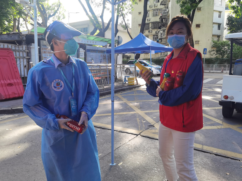 ▲羅湖街道的社區(qū)防疫人員和志愿者拿到了愛(ài)心飲料。(深圳晚報(bào)記者 易芬 攝)