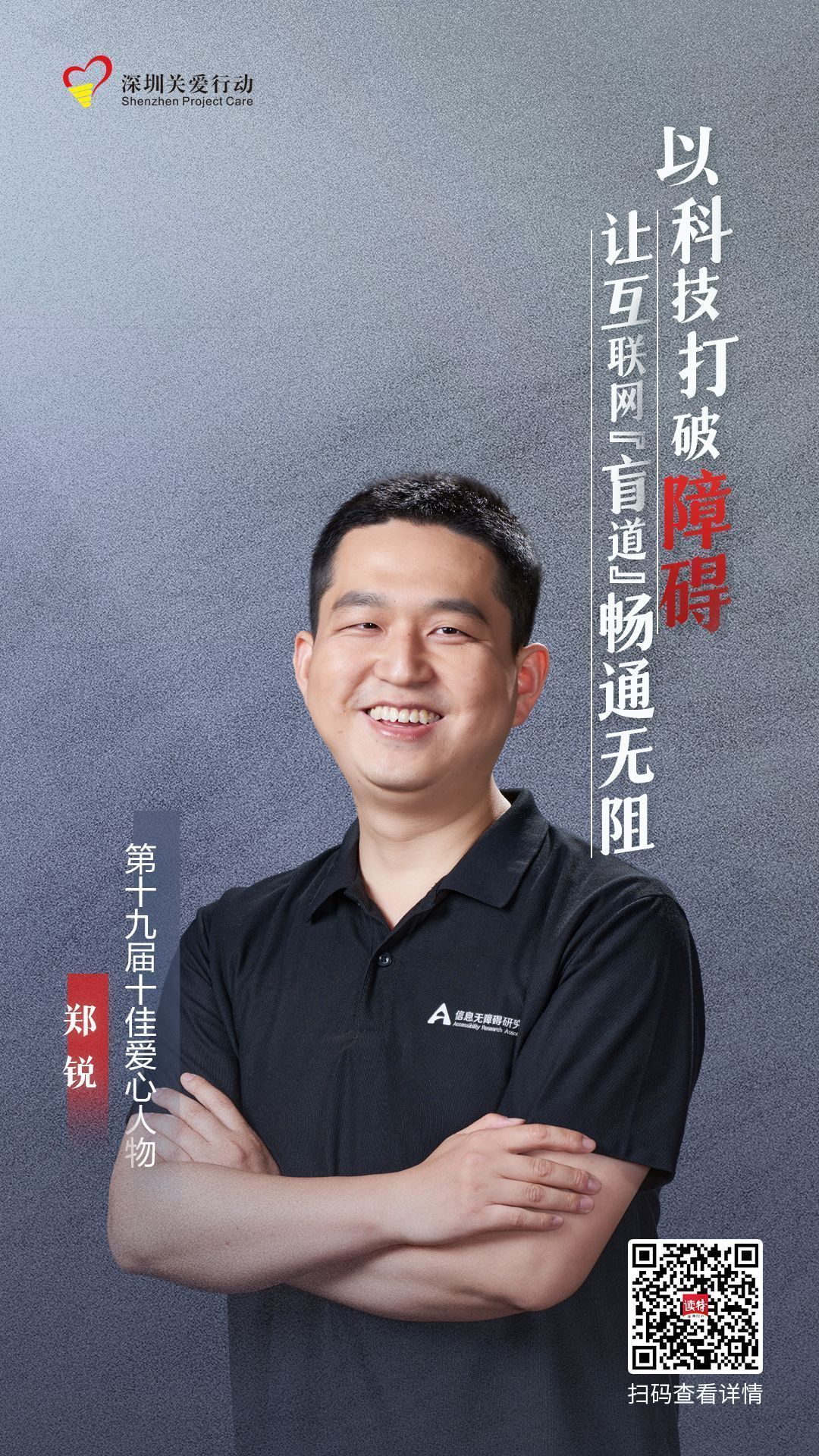 南山區(qū)盲人協(xié)會(huì)主席。鄭銳是一名盲人,而他說自己是一名“盲探”,探索多彩的生活,也為更多的盲人探索道路。疫情期間,他開發(fā)國內(nèi)首個(gè)無障礙疫情資訊小程序,讓視力障礙者可以無障礙地獲取疫情資訊,疫情期間每日訪問的視障朋友高達(dá)2萬多人。他還為企事業(yè)單位、互聯(lián)網(wǎng)公司員工提供無障礙和精準(zhǔn)助盲培訓(xùn),培訓(xùn)后,許多辦事大廳安裝了適合殘疾人辦事所需的輔助器具如讀屏軟件、手寫板、語音輸入器等設(shè)備,并有受過培訓(xùn)的工作人員為殘疾市民提供無障礙服務(wù)。他還在互聯(lián)網(wǎng)短視頻平臺(tái)分享視障者日常生活和普及無障礙相關(guān)內(nèi)容,想讓更多人重新認(rèn)知?dú)堈先后w。推動(dòng)“無障礙環(huán)境”建設(shè),不讓一個(gè)人在數(shù)字世界中掉隊(duì),是他最大的心愿。