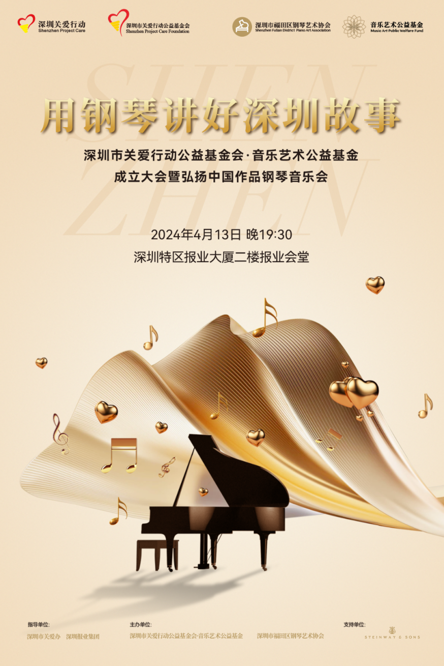 活動(dòng)簡(jiǎn)介:一場(chǎng)公益的創(chuàng)見(jiàn)之旅與音樂(lè)盛典迎著春光綻放,深圳市關(guān)愛(ài)行動(dòng)公益基金會(huì)·音樂(lè)藝術(shù)公益基金成立大會(huì)暨弘揚(yáng)中國(guó)作品鋼琴音樂(lè)會(huì)將于2024年4月13日在深圳特區(qū)報(bào)業(yè)大廈二樓報(bào)業(yè)會(huì)堂舉辦。