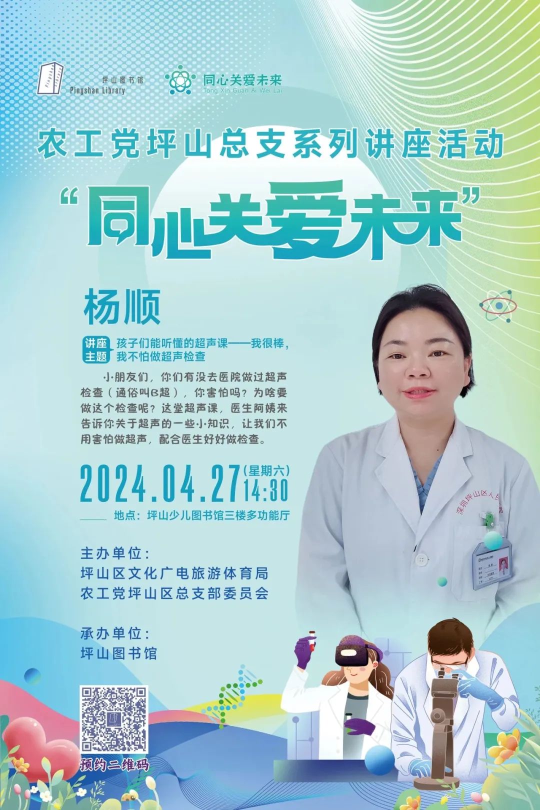 活動(dòng)簡介:“同心關(guān)愛未來”系列活動(dòng)是坪山區(qū)文化廣電旅游體育局與農(nóng)工黨坪山區(qū)總支部委員會(huì)聯(lián)合打造的一項(xiàng)兒童科普閱讀品牌。該活動(dòng)充分發(fā)揮農(nóng)工黨坪山區(qū)總支部委員會(huì)界別特色和專業(yè)優(yōu)勢,采用兒童喜聞樂見的方式,科普常見醫(yī)學(xué)健康專業(yè)知識(shí) ?;顒?dòng)自2024年4月起,以每月一期的頻率,在坪山少兒圖書館定點(diǎn)舉辦。