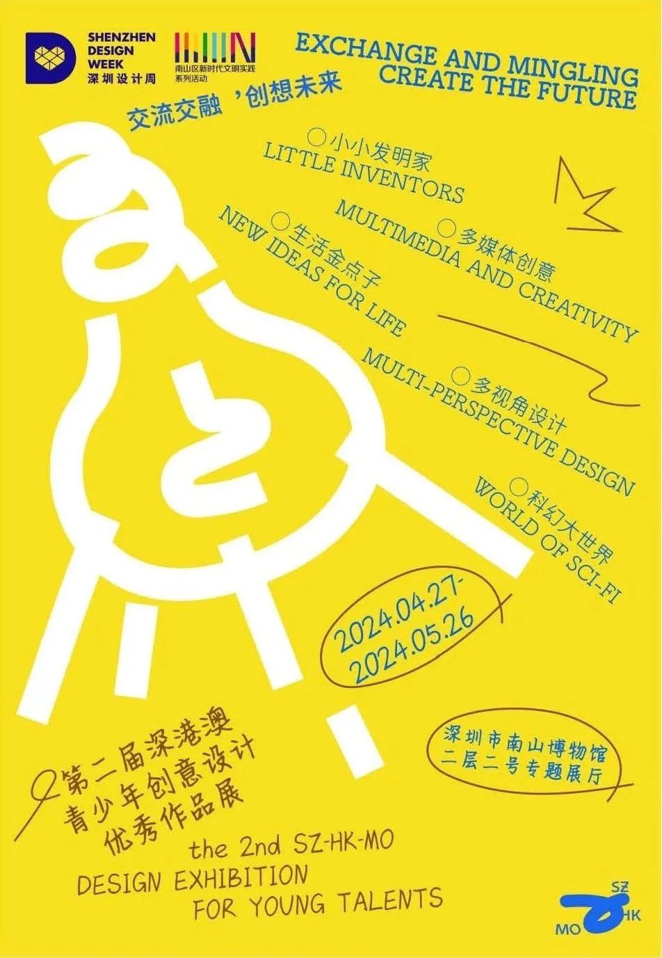 活動(dòng)簡介:本次展覽以“明天的創(chuàng)想,未來的設(shè)計(jì)”為主題,展出來自深港澳三地、年齡不超過20周歲(含20歲)青少年的128件作品。整個(gè)展區(qū)分為“小小發(fā)明家”展區(qū)、多媒體創(chuàng)意展區(qū)、生活金點(diǎn)子展區(qū)、多視角設(shè)計(jì)展區(qū)、科幻大世界展區(qū)和互動(dòng)打卡區(qū)六大板塊。旨在通過創(chuàng)意與設(shè)計(jì)作品展現(xiàn)深港澳地區(qū)青少年對(duì)大灣區(qū)未來的精彩描繪與美好憧憬,促進(jìn)三地青少年之間的交往交流、交心交融,共同塑造和豐富灣區(qū)人文精神內(nèi)涵,在創(chuàng)意設(shè)計(jì)領(lǐng)域形成常態(tài)化的交流互動(dòng)。