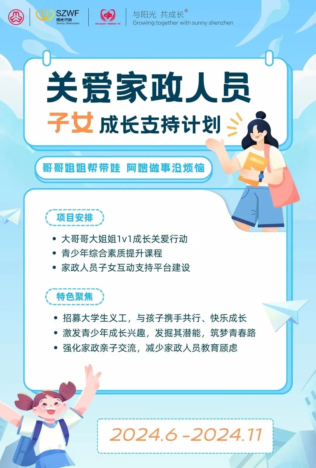 活動簡介:隨著社會的發(fā)展和人們生活節(jié)奏的加快,家政服務(wù)已經(jīng)成為越來越多家庭的需求,家政人員為我們的生活提供便利的同時他們的子女卻因?yàn)楦改傅墓ぷ鞣泵Χ狈ε惆楹完P(guān)注。為此,深圳市婦聯(lián)發(fā)起關(guān)愛家政人員子女成長支持計劃,通過招募大學(xué)生志愿者為全市100個家政人員子女提供關(guān)愛成長服務(wù)。
