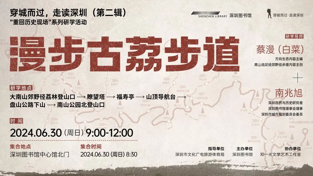 活動簡介:嶺南四時春,入夏荔枝紅。在嶺南荔枝成熟的最好時節(jié),深圳圖書館舉辦“穿城而過,走讀深圳”(第二輯)“重回歷史現(xiàn)場”系列研學(xué)活動,邀請深圳自然與歷史研究者南兆旭、方向生態(tài)內(nèi)容主編蔡漫,帶領(lǐng)市民讀者一同漫步古荔步道,探究深圳種植荔枝的緣起,了解各式荔枝的品類,品讀嶺南荔枝文化。