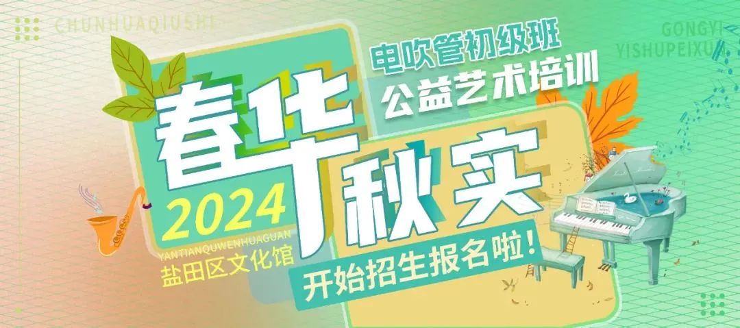 活動簡介:深圳市鹽田區(qū)文化館已成功開辦多期電吹管零基礎(chǔ)公益培訓(xùn)課,為熱愛電吹管的人群開啟了一扇通往音樂藝術(shù)殿堂的大門。為了滿足更多音樂愛好者的學(xué)習(xí)熱情,鹽田區(qū)文化館將增設(shè)“春華秋實(shí)”電吹管初級班公益培訓(xùn)課。