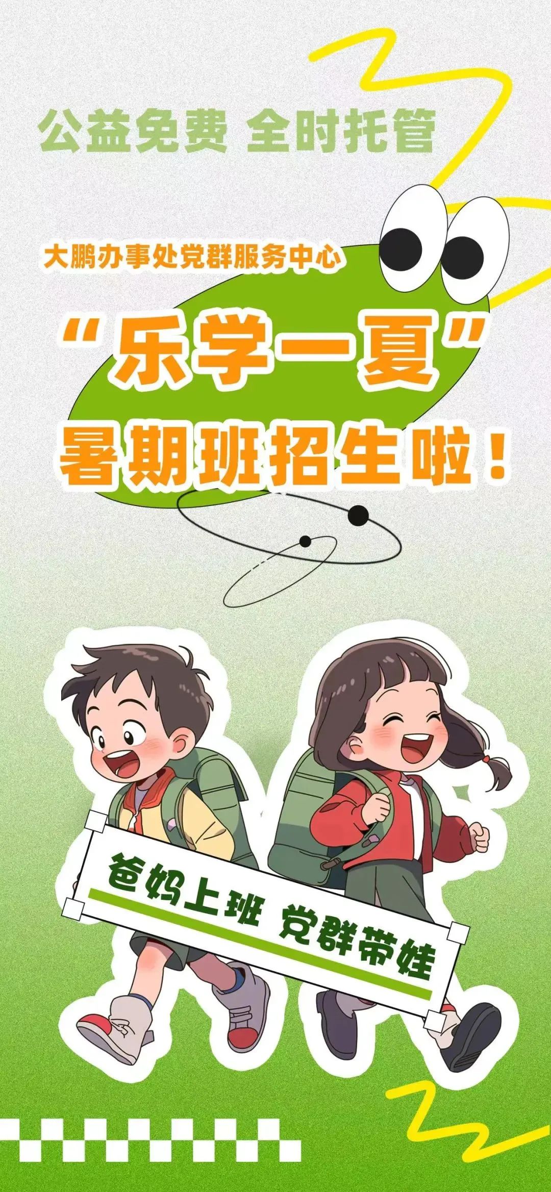 活動簡介:暑假來了,孩子看護成難題?暑期作業(yè)輔導成煩惱?如何為孩子開啟一段歡快的暑期之旅?別擔心,大鵬辦事處黨群服務中心備好了解憂良策。面向大鵬辦事處轄區(qū)1-6年級(7-12周歲)學齡期兒童青少年開設兩期全時托管班。尤克里里、陶笛、書法、手抄報、科技創(chuàng)意實踐、二十四節(jié)氣非遺手工、紅色電影、趣味課堂、作業(yè)輔導……在這里,孩子們將體驗多元化智趣課堂活動,練就“十八般武藝”,德智體美勞全面綻放。