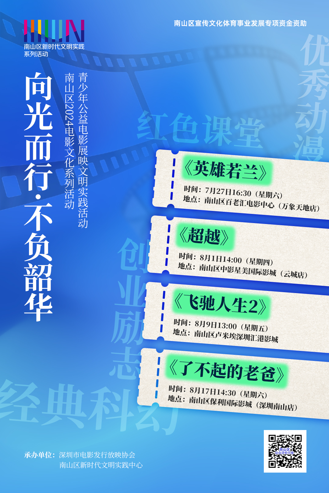 活動簡介:7月27日至8月18日,南山區(qū)聯(lián)動區(qū)內(nèi)15家影院,精心策劃準備了百場免費觀影活動送給青少年們。影片包含“經(jīng)典科幻”“優(yōu)秀動漫”“紅色課堂”“創(chuàng)業(yè)勵志”四個篇章,《流浪地球2》《新神榜:哪吒重生》《我和我的父輩》《飛馳人生2》等超40部主題影片供大家選擇。