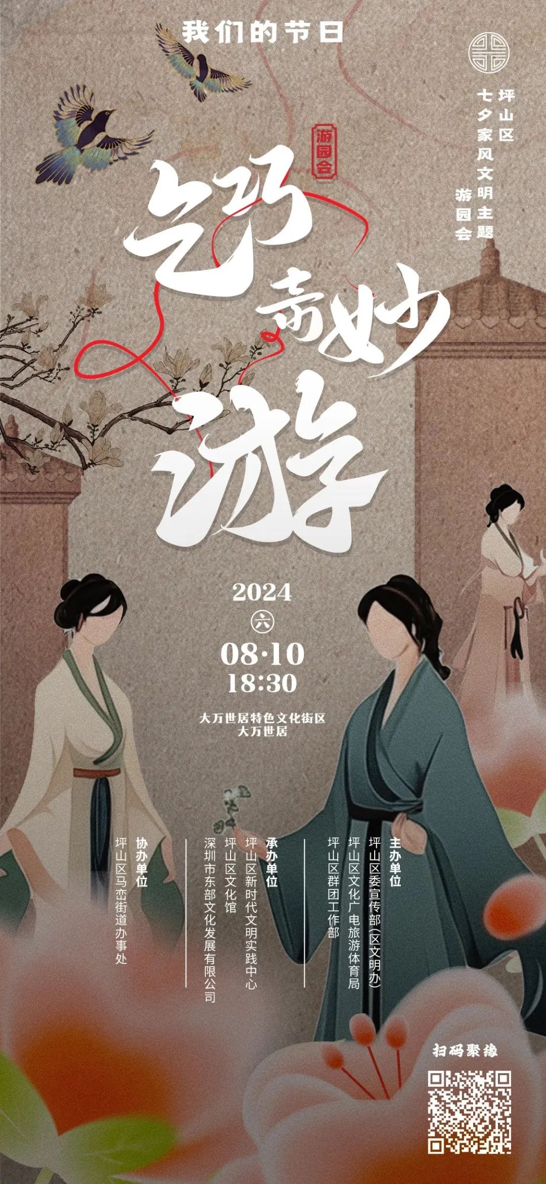 活動簡介:由坪山區(qū)委宣傳部(區(qū)文明辦)、坪山區(qū)文化廣電旅游體育局、坪山區(qū)群團工作部主辦的“乞巧奇妙游——坪山區(qū)‘我們的節(jié)日’七夕家風文明主題游園會”將于百年客家圍屋——大萬世居,開展一場別開生面的七夕國風交友會,誠邀四方雅士,共赴這場穿越時空的情緣盛宴。