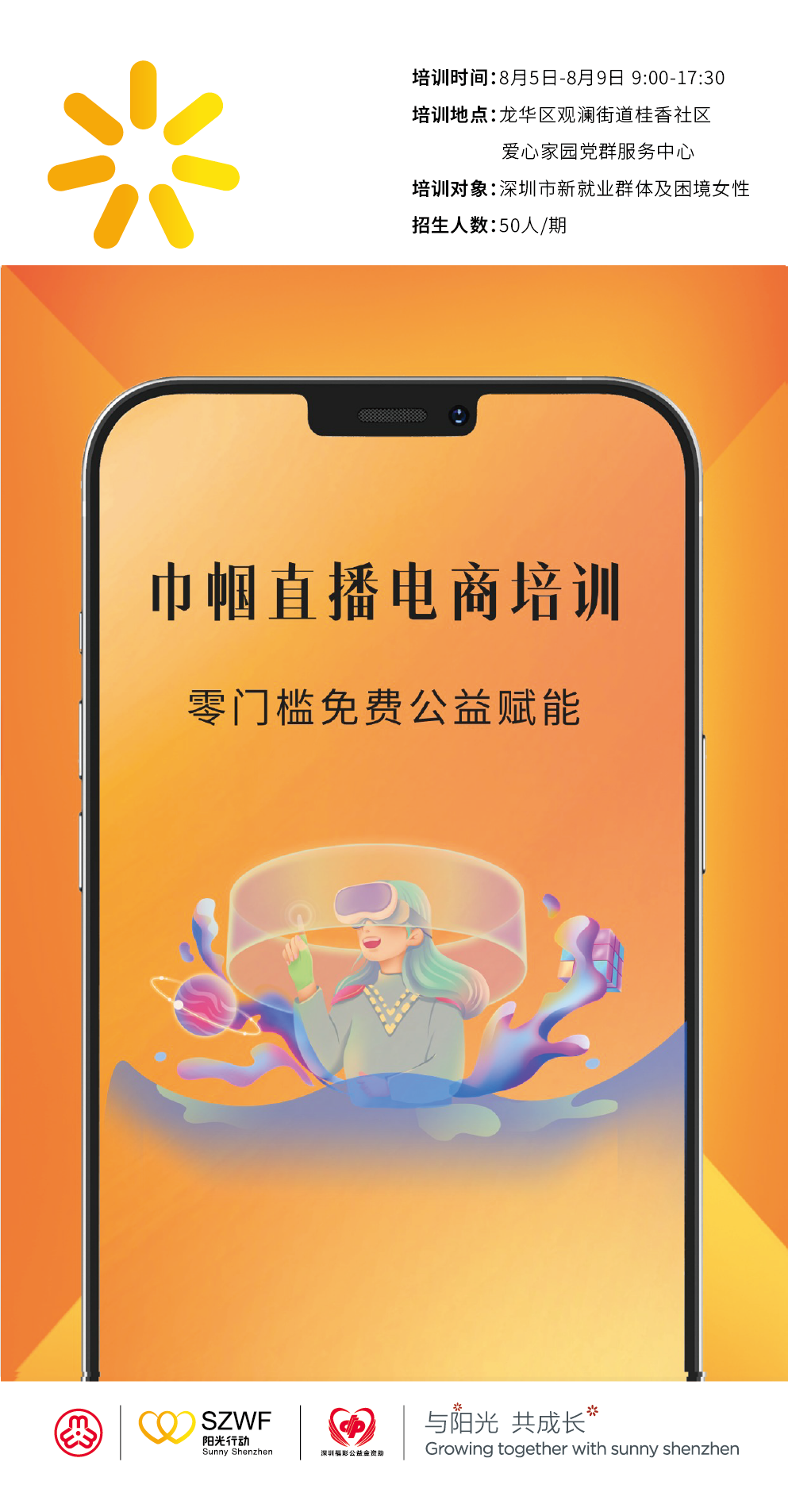 活動簡介:為助力女性就業(yè)創(chuàng)業(yè),深圳市婦聯(lián)推出“巾幗直播”電商就業(yè)創(chuàng)業(yè)賦能項目,通過學習巾幗直播電商就業(yè)創(chuàng)業(yè)幫扶公益課程,掌握直播帶貨技能,為新就業(yè)群體及困境女性拓寬就業(yè)渠道,創(chuàng)造就業(yè)機會。
